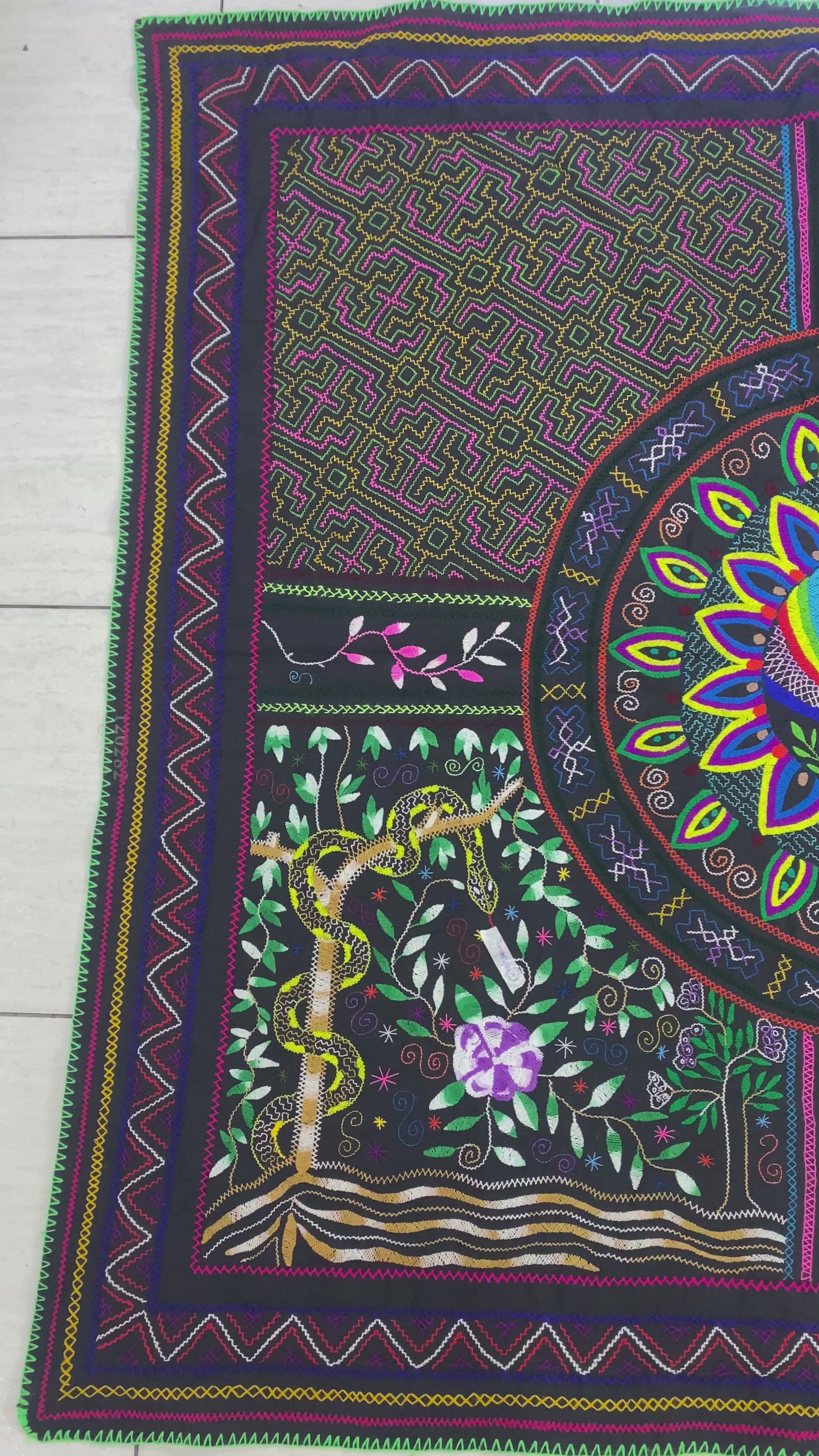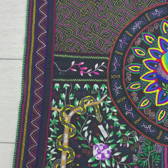 This hand embroidered tapestry was made by the Shipibo Conibo tribe who live in the Peruvian Amazon Rainforest in the provinces of Pucallpa. This tapestry is made by hand with no machines involved in the process. It can be used as a tablecloth or a wall tapestry.