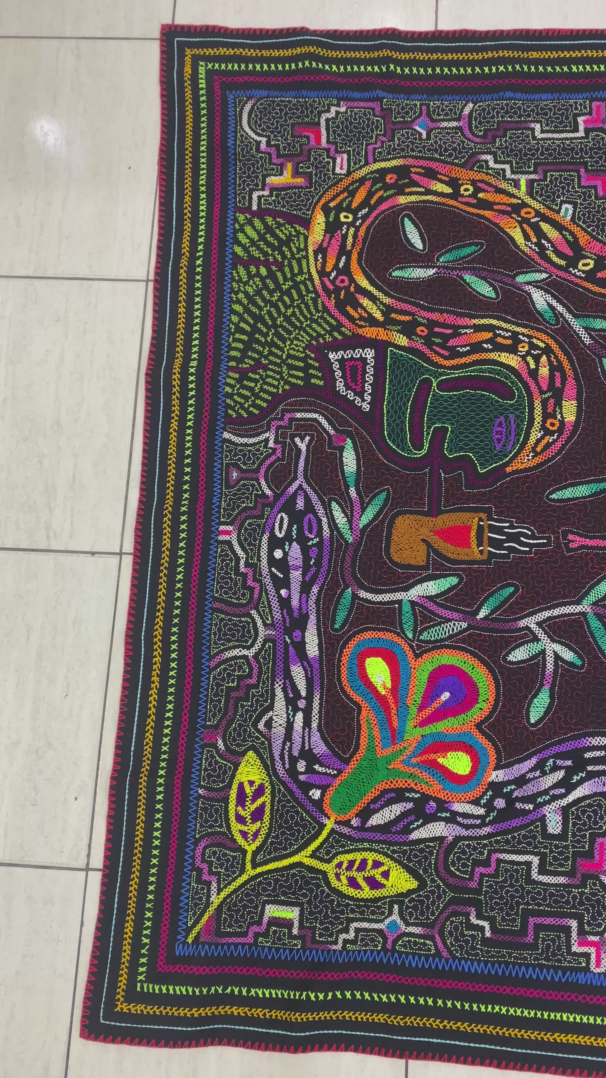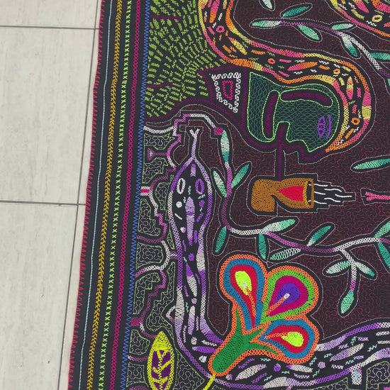 This hand embroidered tapestry was made by the Shipibo Conibo tribe who live in the Peruvian Amazon Rainforest in the provinces of Pucallpa. This tapestry is made by hand with no machines involved in the process. It can be used as a tablecloth or a wall tapestry.