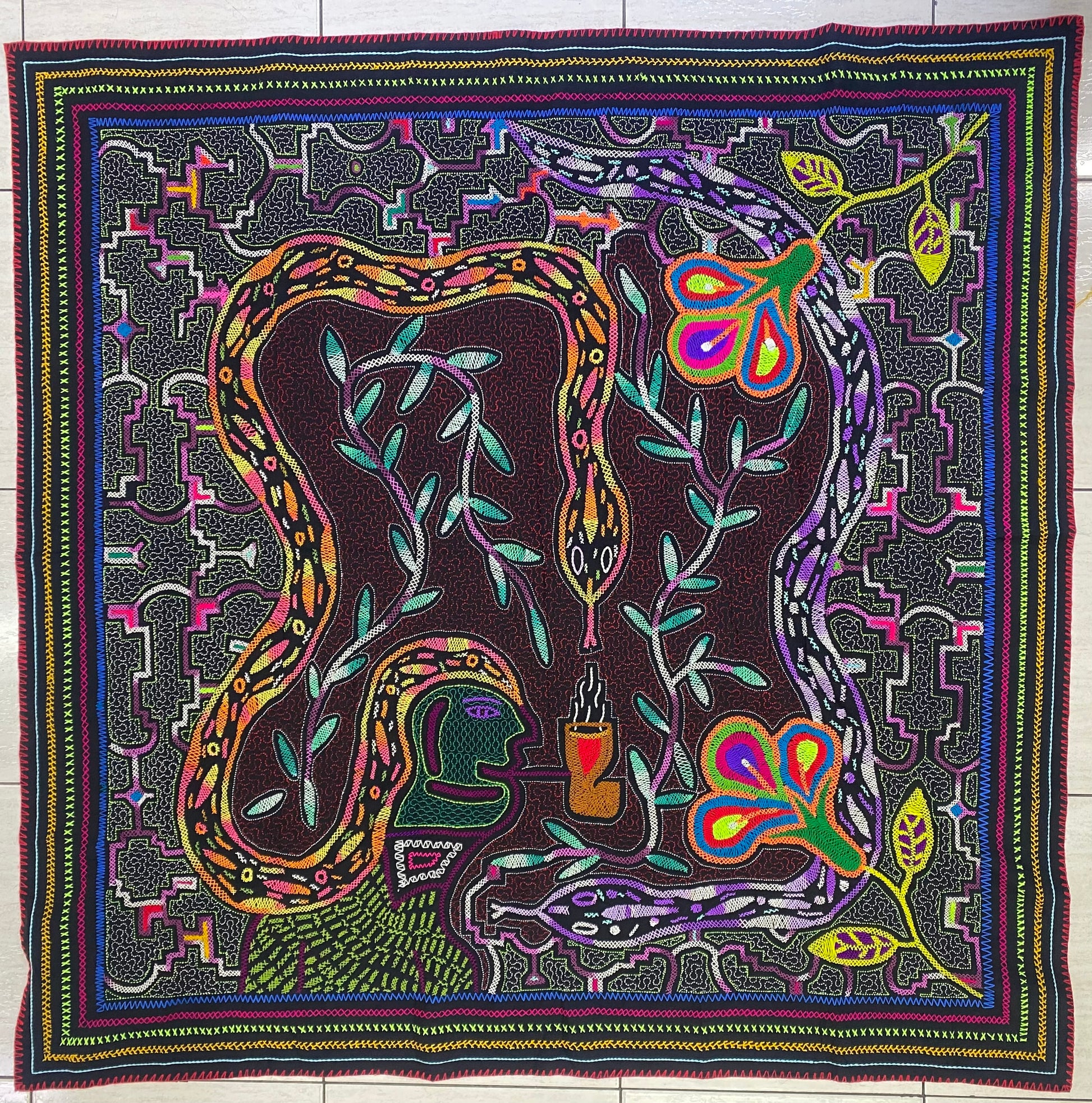 Shipibo Conibo Serpent Tapestry Hand Embroidered Peruvian Tablecloth Textile Ceremonial Amazonian Shamanic Altar 55.11” x 56.70”