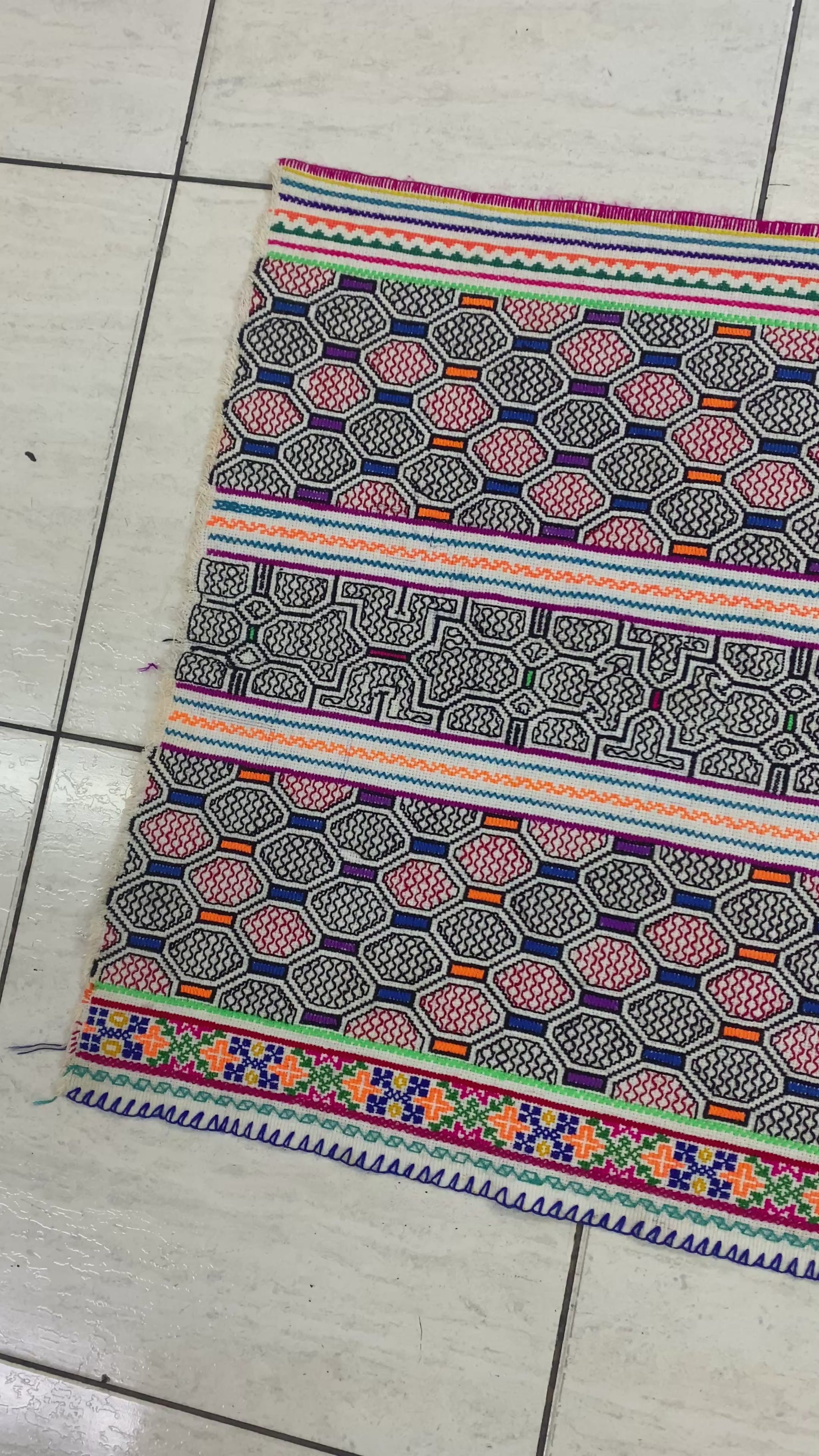 This hand embroidered tapestry was made by the Shipibo Conibo tribe who live in the Peruvian Amazon Rainforest in the provinces of Pucallpa. This tapestry is made by hand with no machines involved in the process. It can be used as a tablecloth or a wall tapestry.
