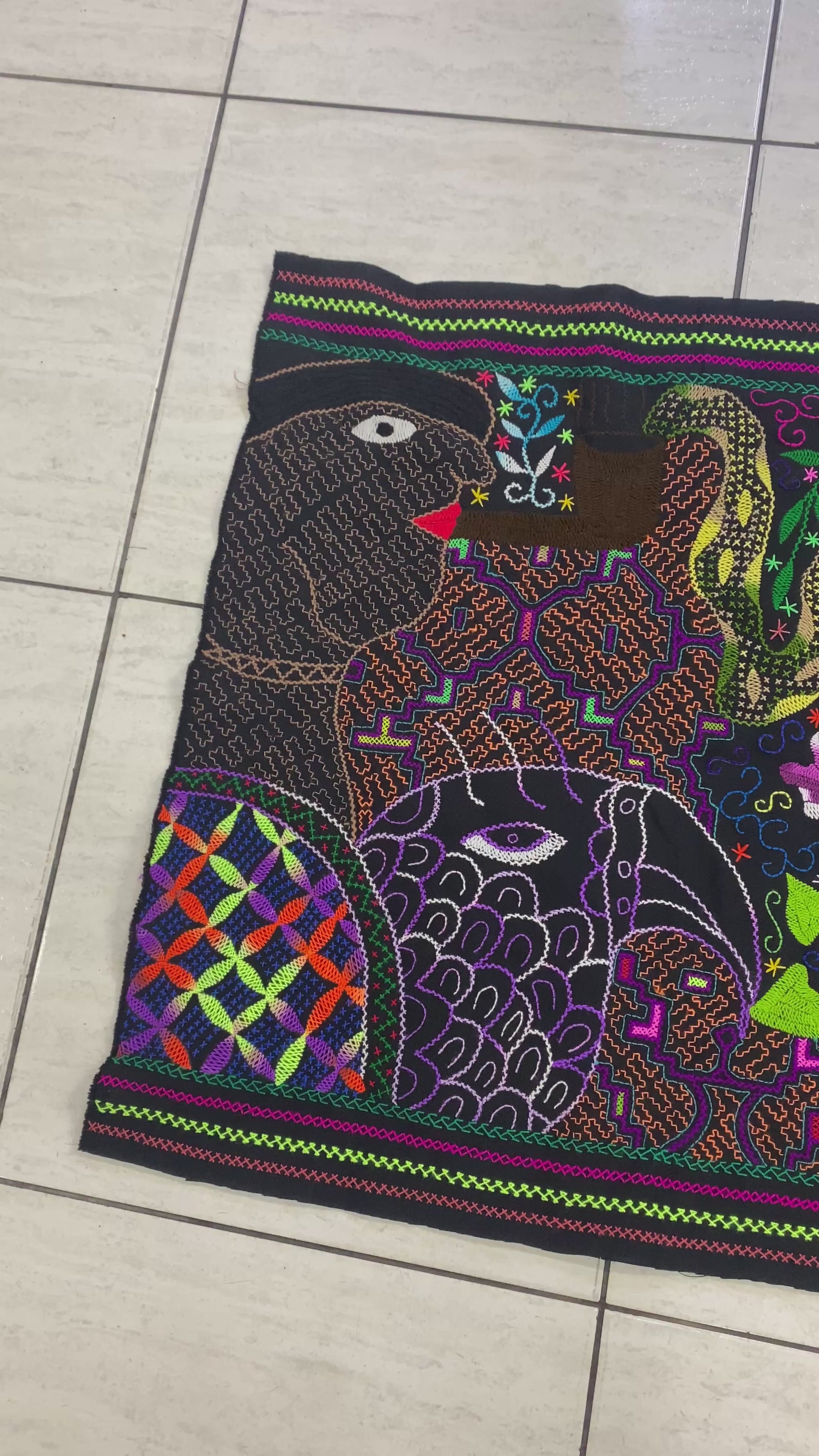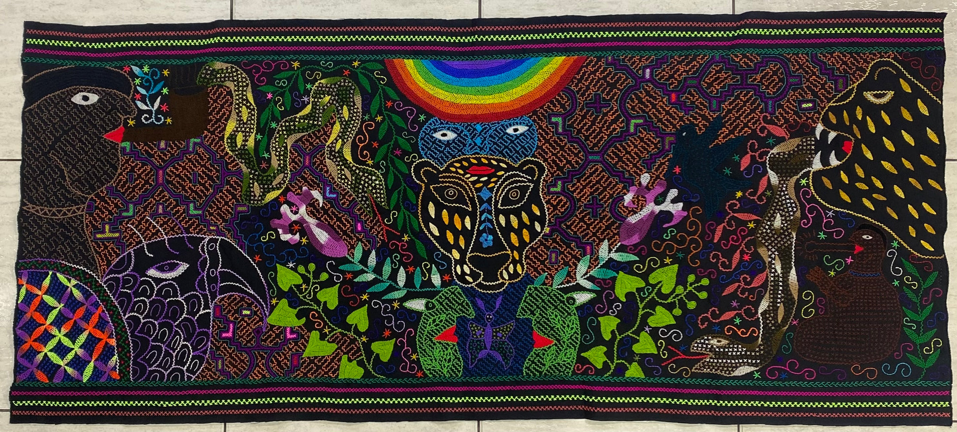 This hand embroidered tapestry was made by the Shipibo Conibo tribe who live in the Peruvian Amazon Rainforest in the provinces of Pucallpa. This tapestry is made by hand with no machines involved in the process. It can be used as a tablecloth or a wall tapestry.