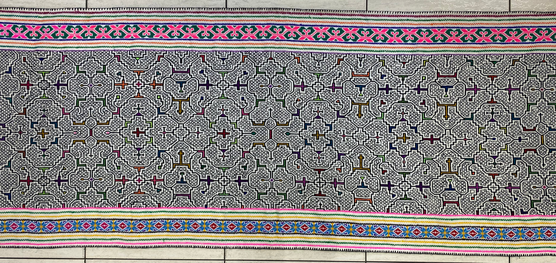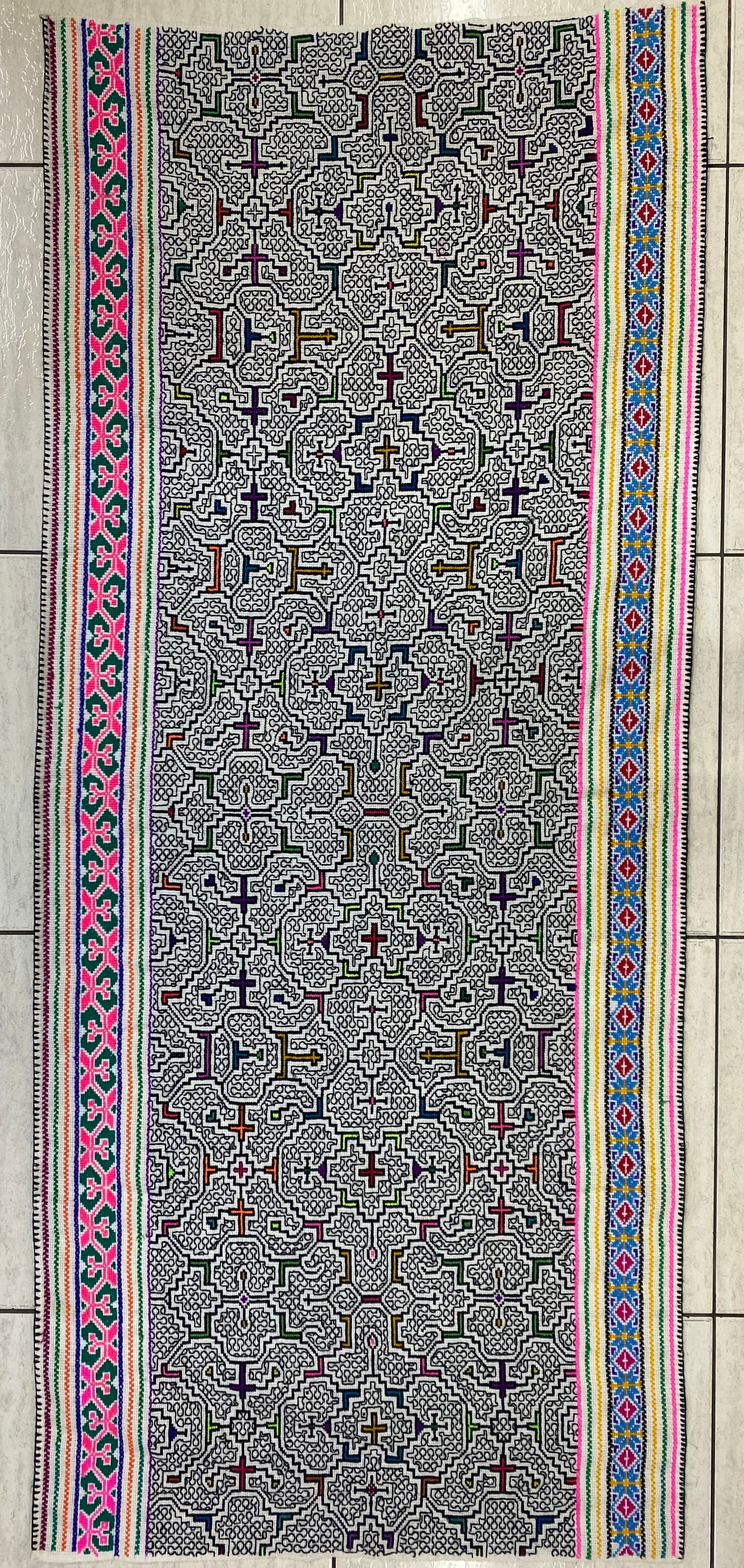 Shipibo Conibo Kené Tabletop Tapestry Hand Embroidered Peruvian Tablecloth Textile Ceremonial Amazonian Shamanic Altar 63”x28.5”