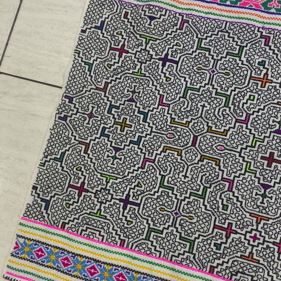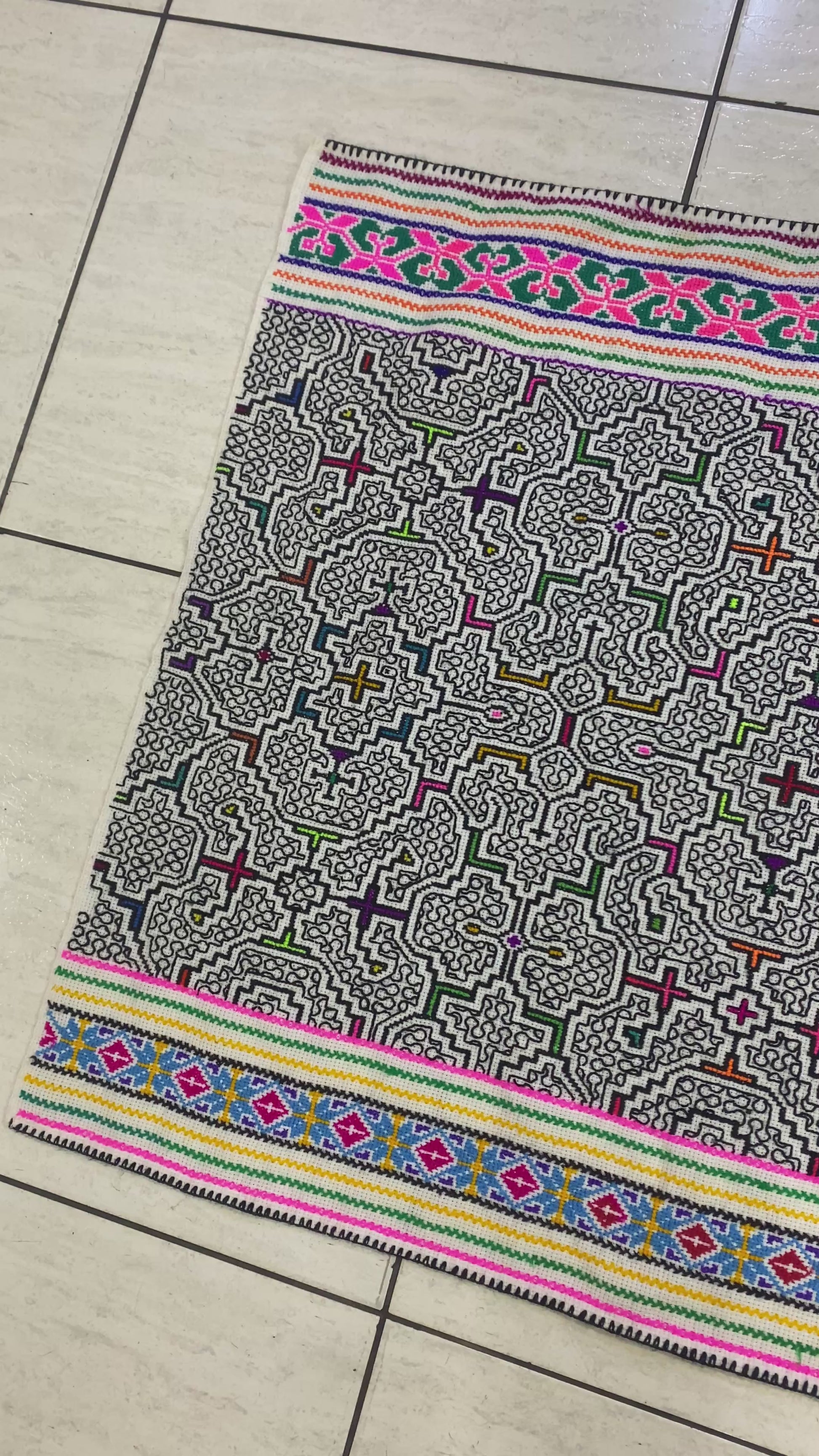 This hand embroidered tapestry was made by the Shipibo Conibo tribe who live in the Peruvian Amazon Rainforest in the provinces of Pucallpa. This tapestry is made by hand with no machines involved in the process. It can be used as a tablecloth or a wall tapestry.