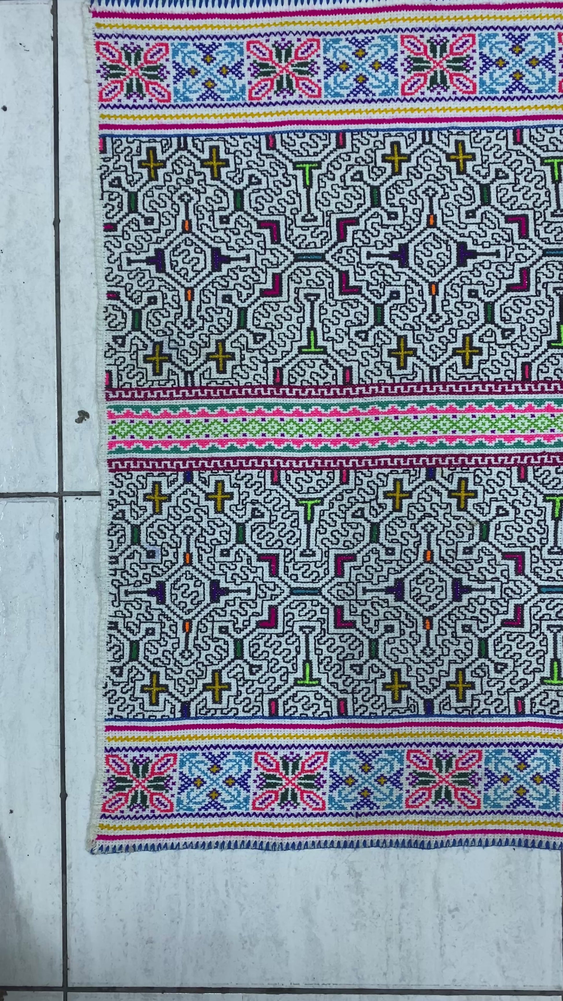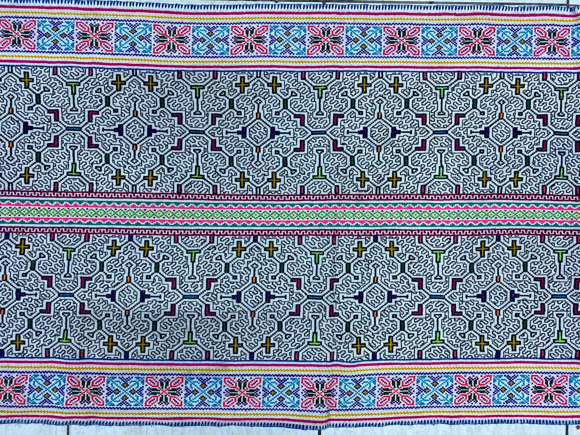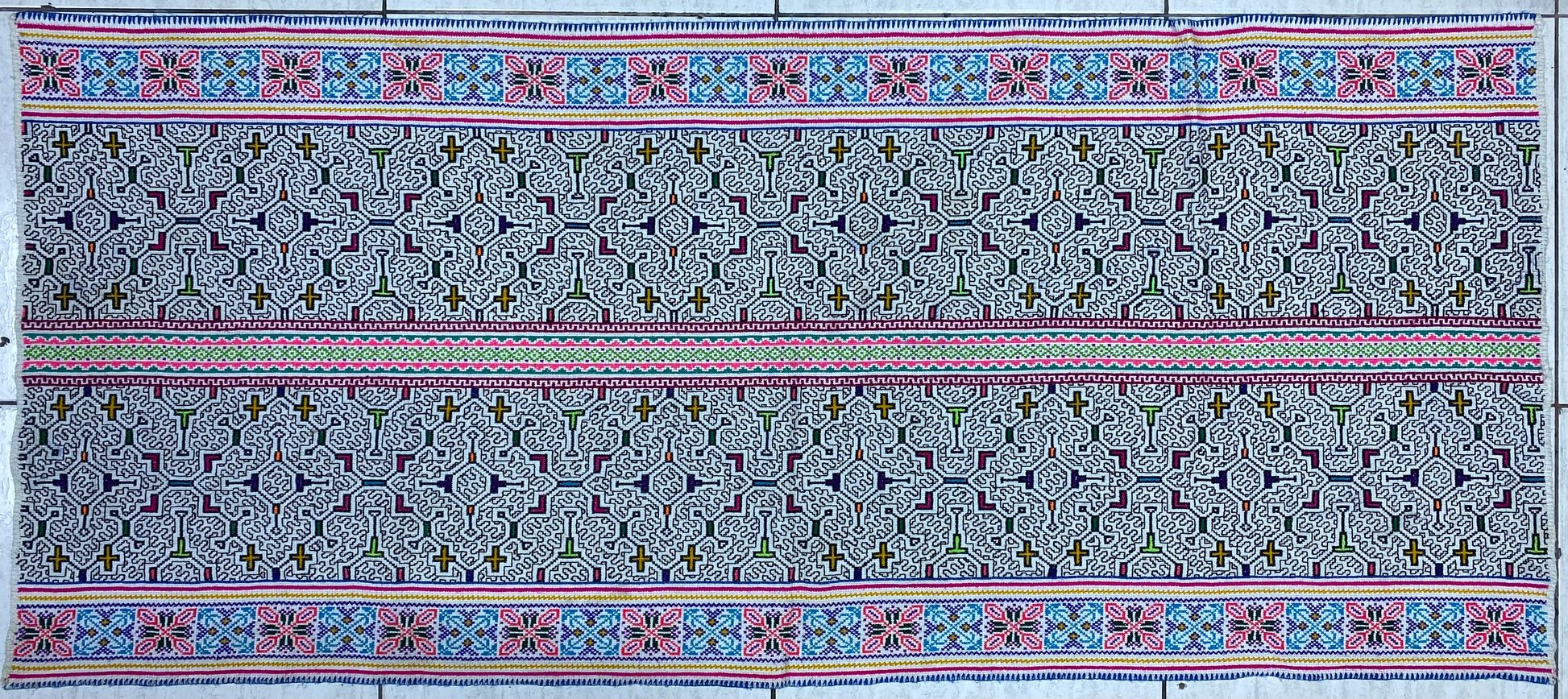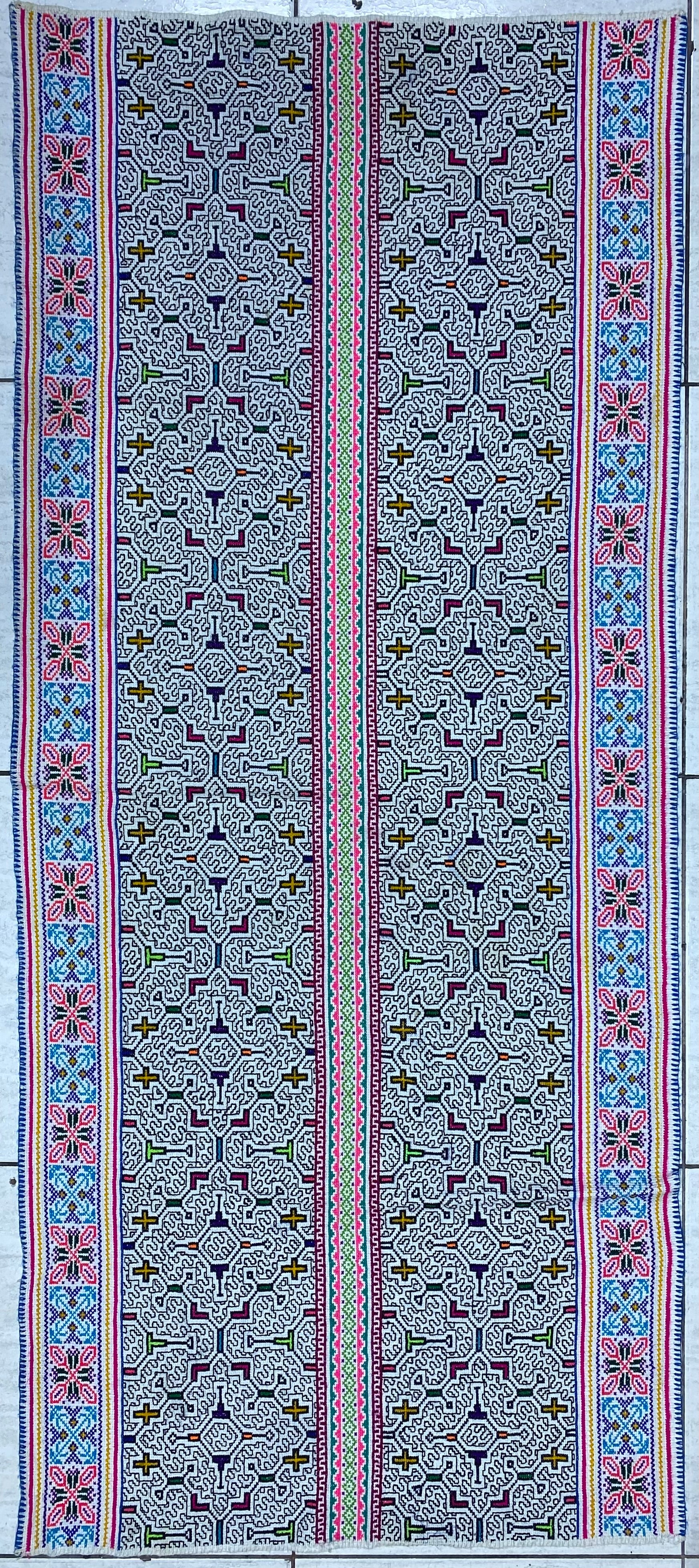 Shipibo Conibo Kené Tabletop Tapestry Hand Embroidered Peruvian Tablecloth Textile Ceremonial Amazonian Shamanic Altar 64”x 27.5”