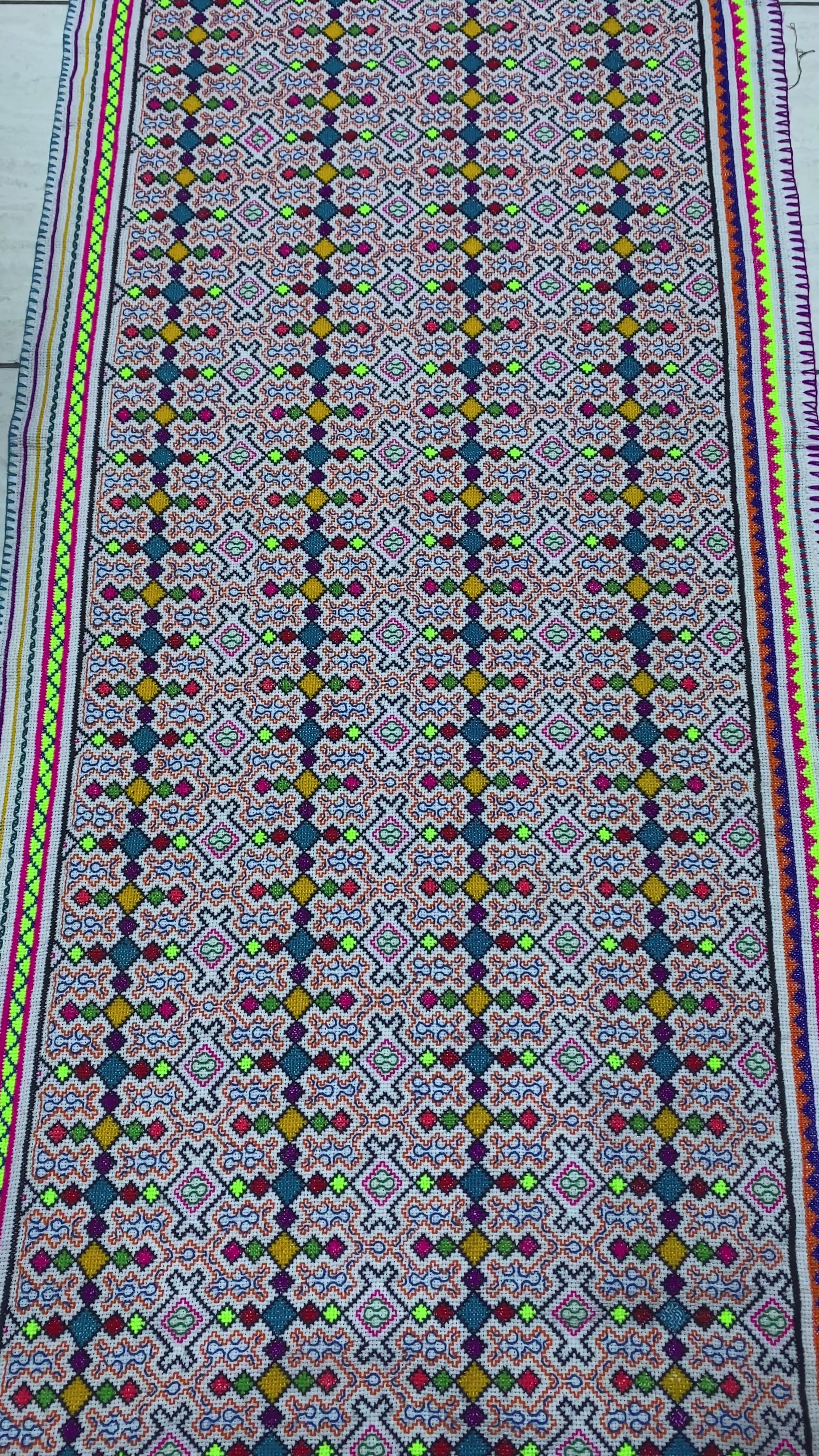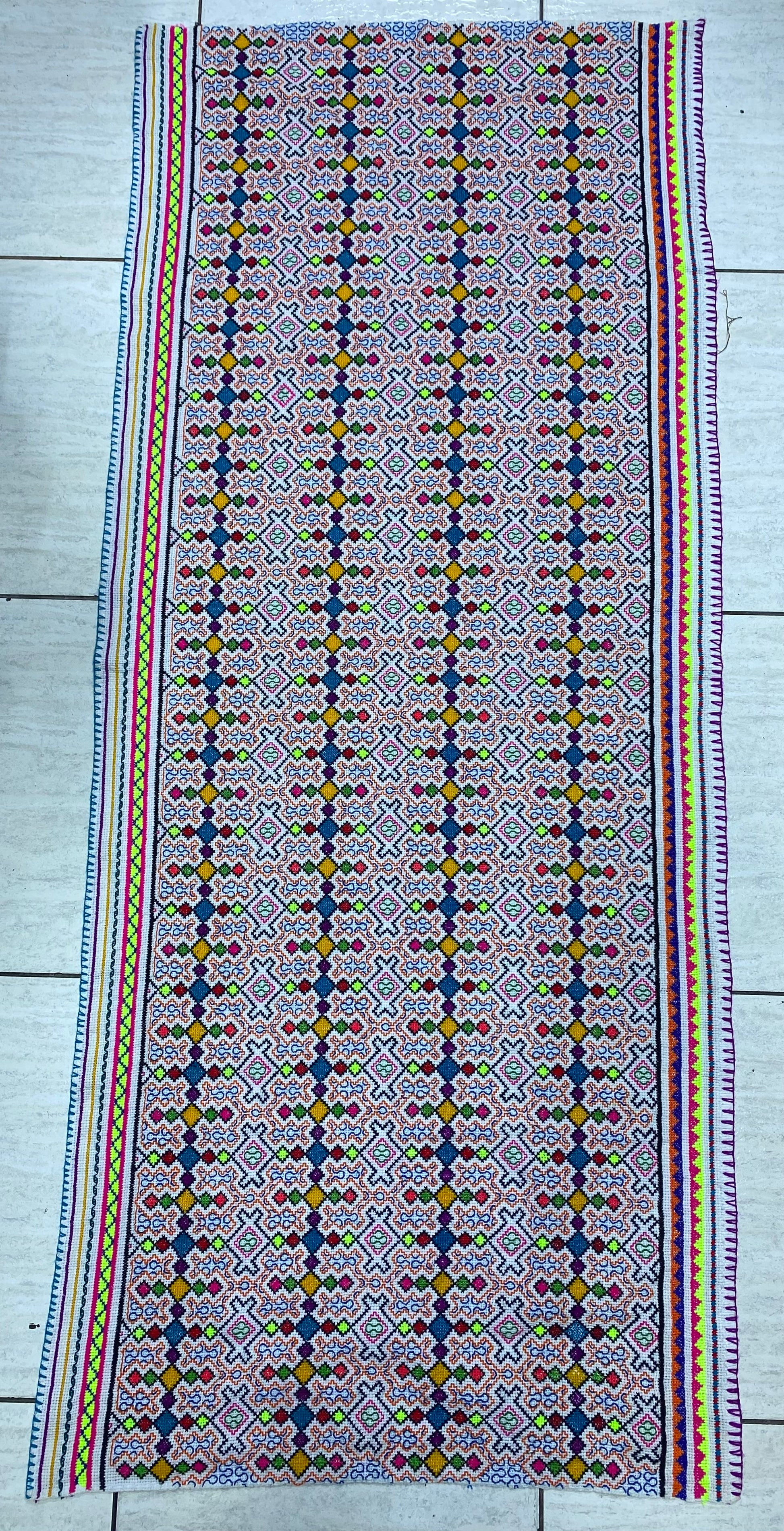 Shipibo Conibo Kené Tabletop Tapestry Hand Embroidered Peruvian Tablecloth Textile Ceremonial Amazonian Shamanic Altar 62.20” x 24”