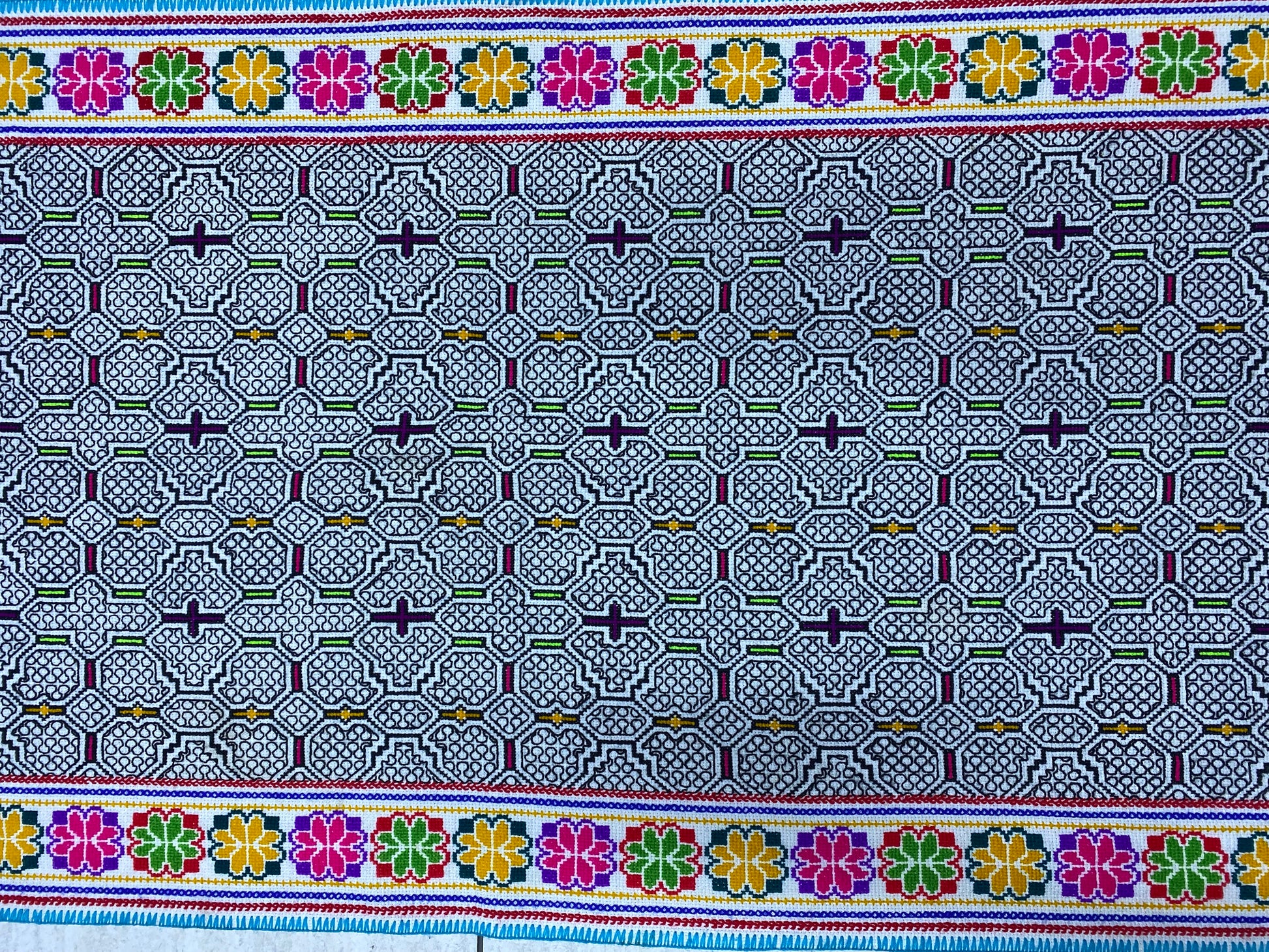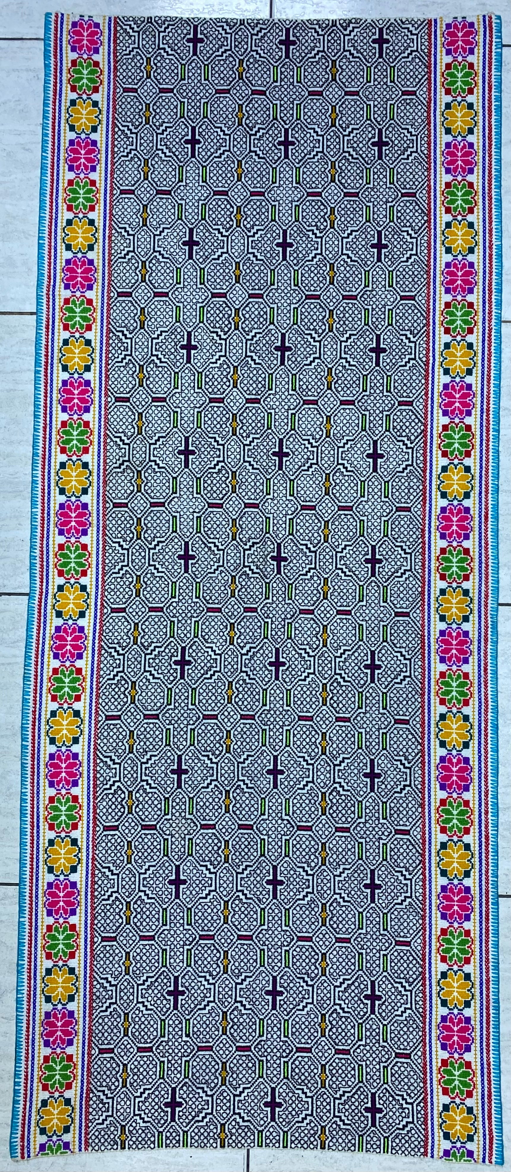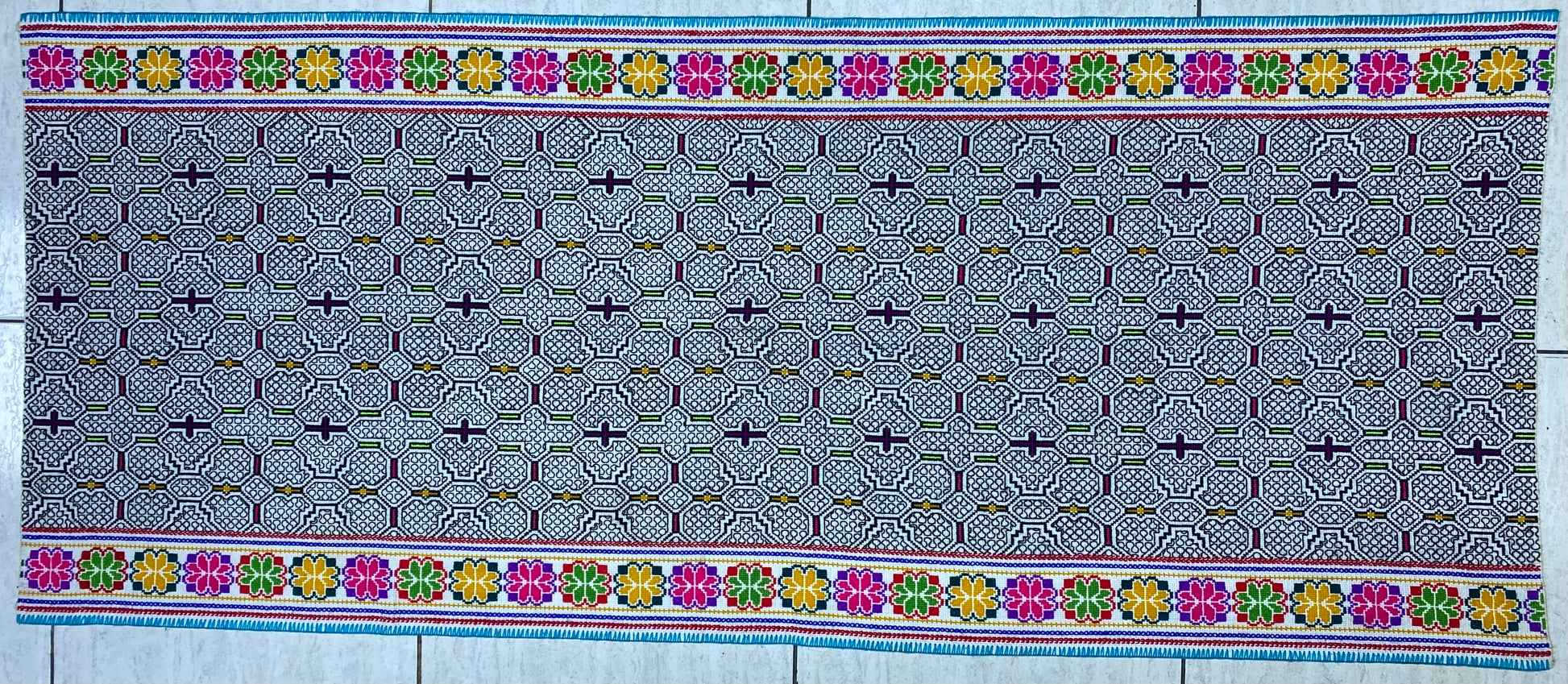 Shipibo Conibo Kené Tabletop Tapestry Hand Embroidered Peruvian Tablecloth Textile Ceremonial Amazonian Shamanic Altar 65”x 26”