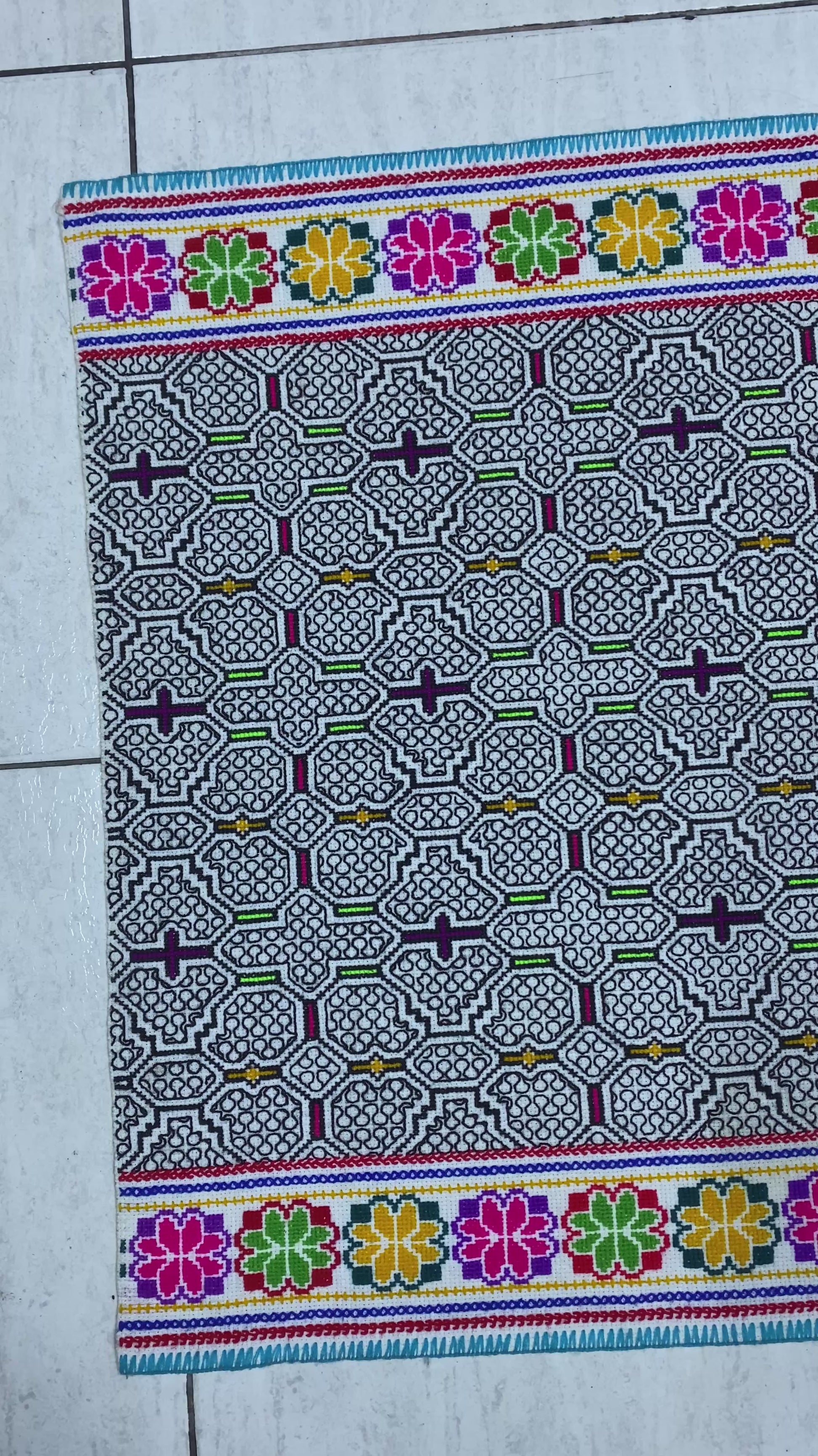 This hand embroidered tapestry was made by the Shipibo Conibo tribe who live in the Peruvian Amazon Rainforest in the provinces of Pucallpa. This tapestry is made by hand with no machines involved in the process. It can be used as a tablecloth or a wall tapestry.