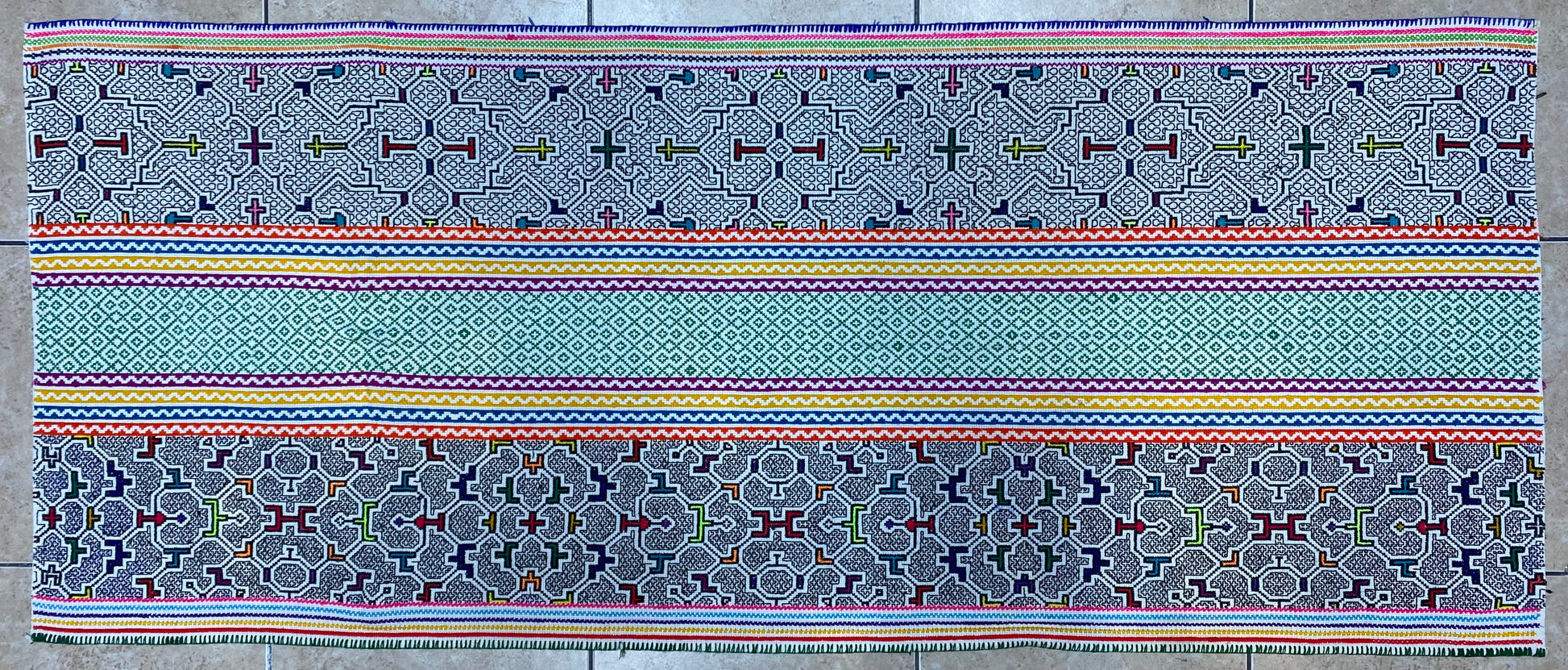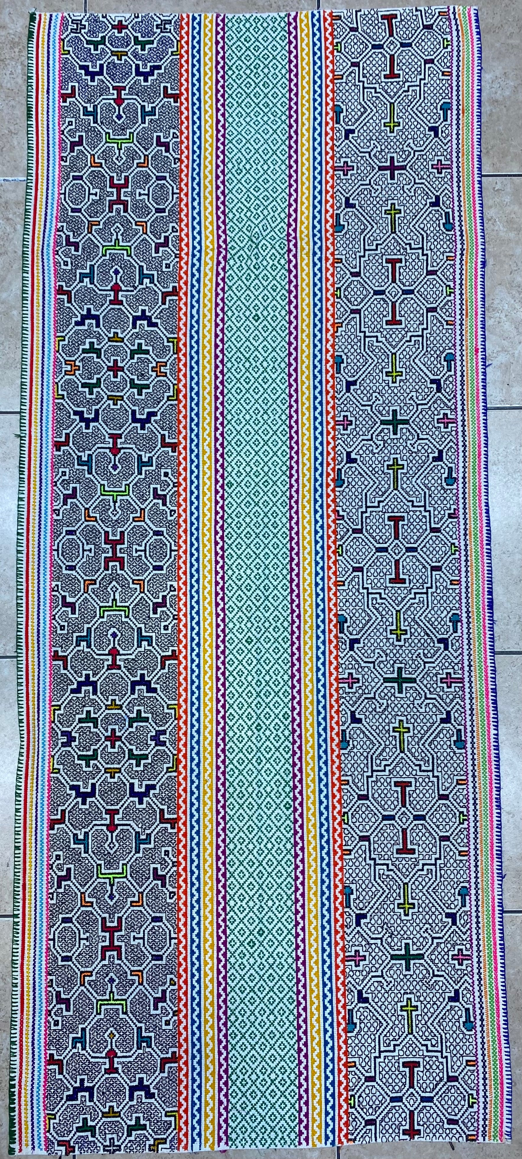 Shipibo Conibo Kené Tabletop Tapestry Hand Embroidered Peruvian Tablecloth Textile Ceremonial Amazonian Shamanic Altar 60”x 25”
