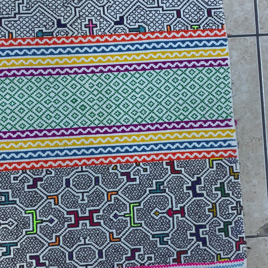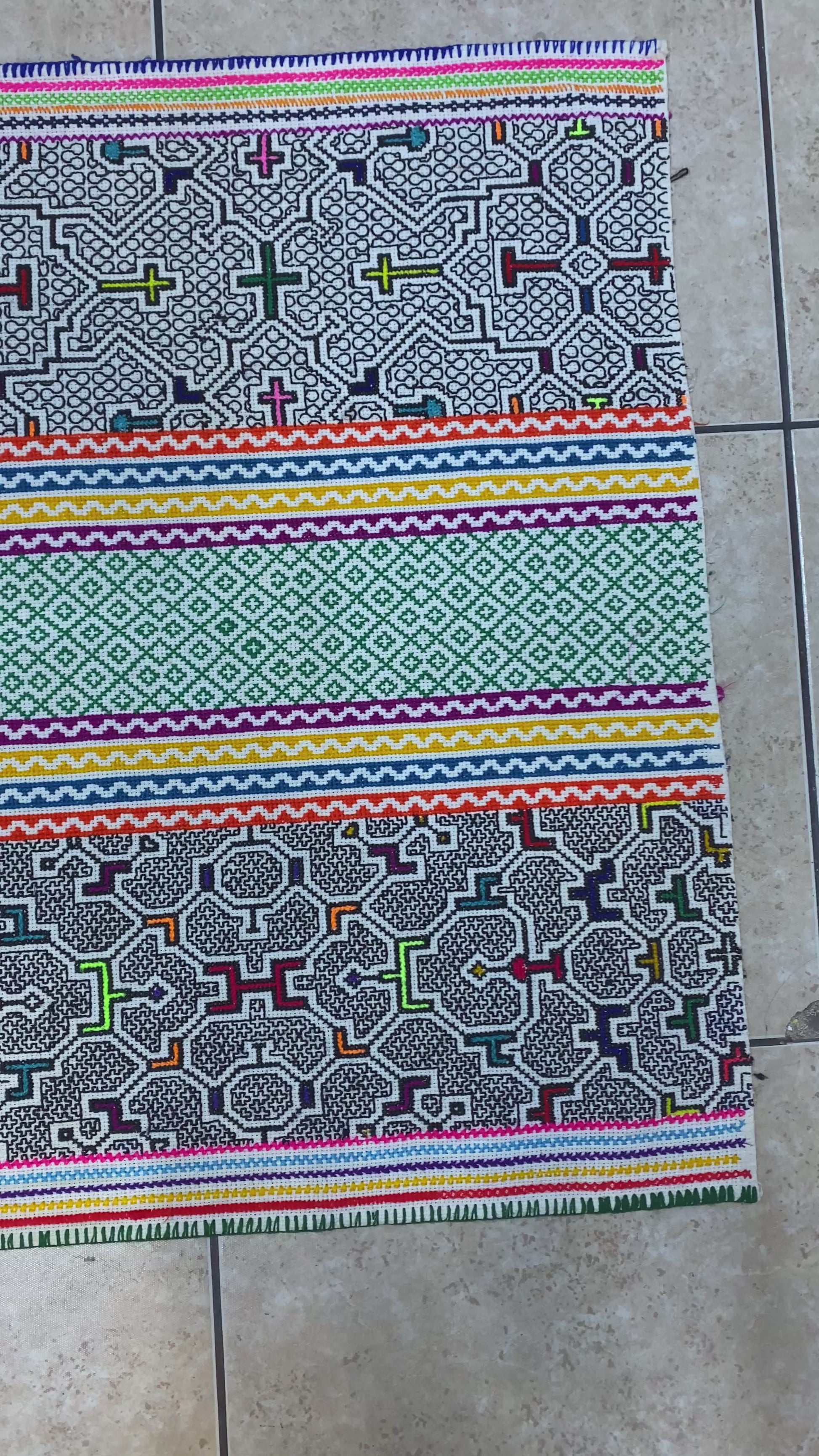 This hand embroidered tapestry was made by the Shipibo Conibo tribe who live in the Peruvian Amazon Rainforest in the provinces of Pucallpa. This tapestry is made by hand with no machines involved in the process. It can be used as a tablecloth or a wall tapestry.
