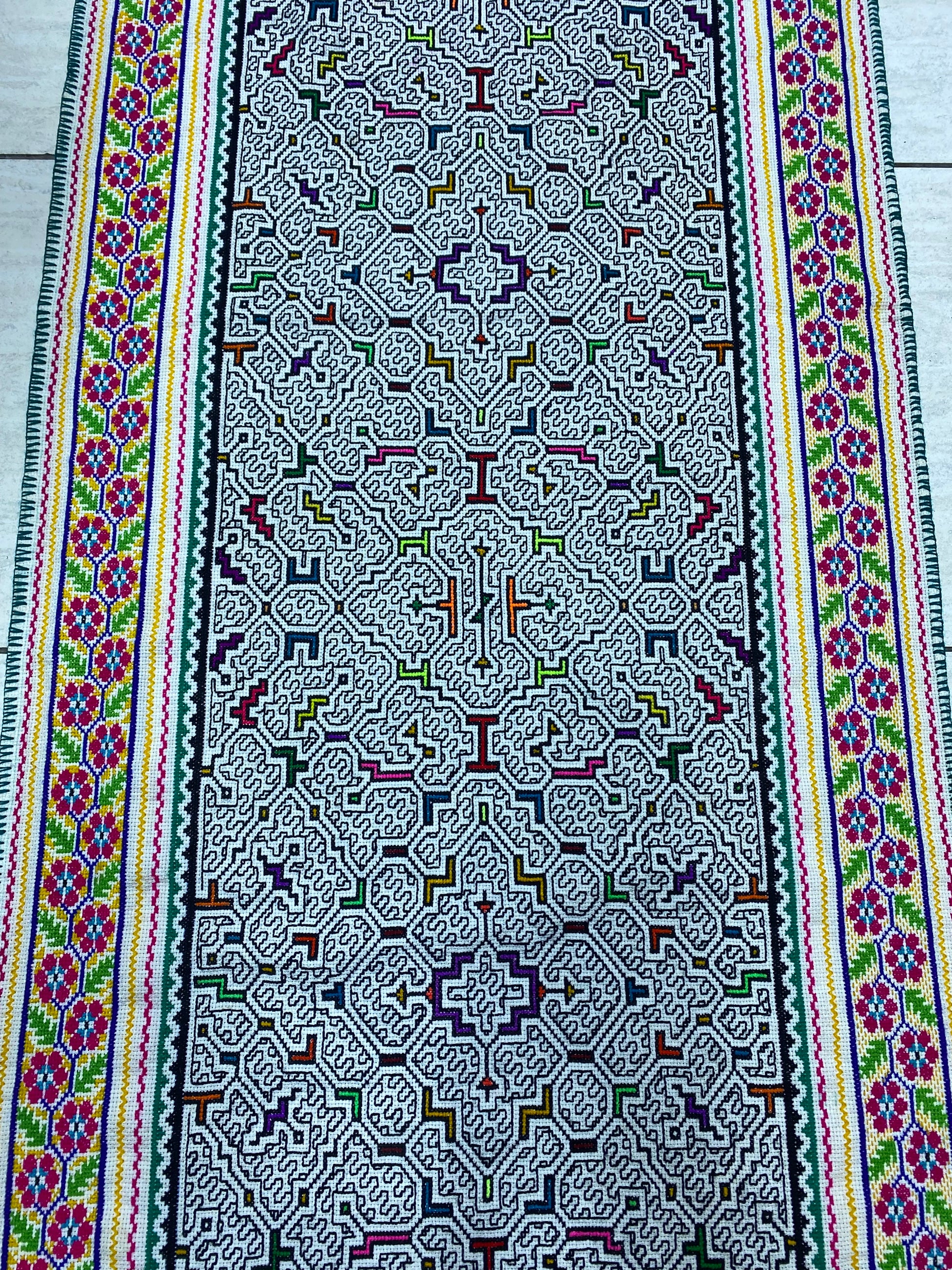 Shipibo Conibo Kené Tabletop Tapestry Hand Embroidered Peruvian Tablecloth Textile Ceremonial Amazonian Shamanic Altar 68.11” x 27.16”