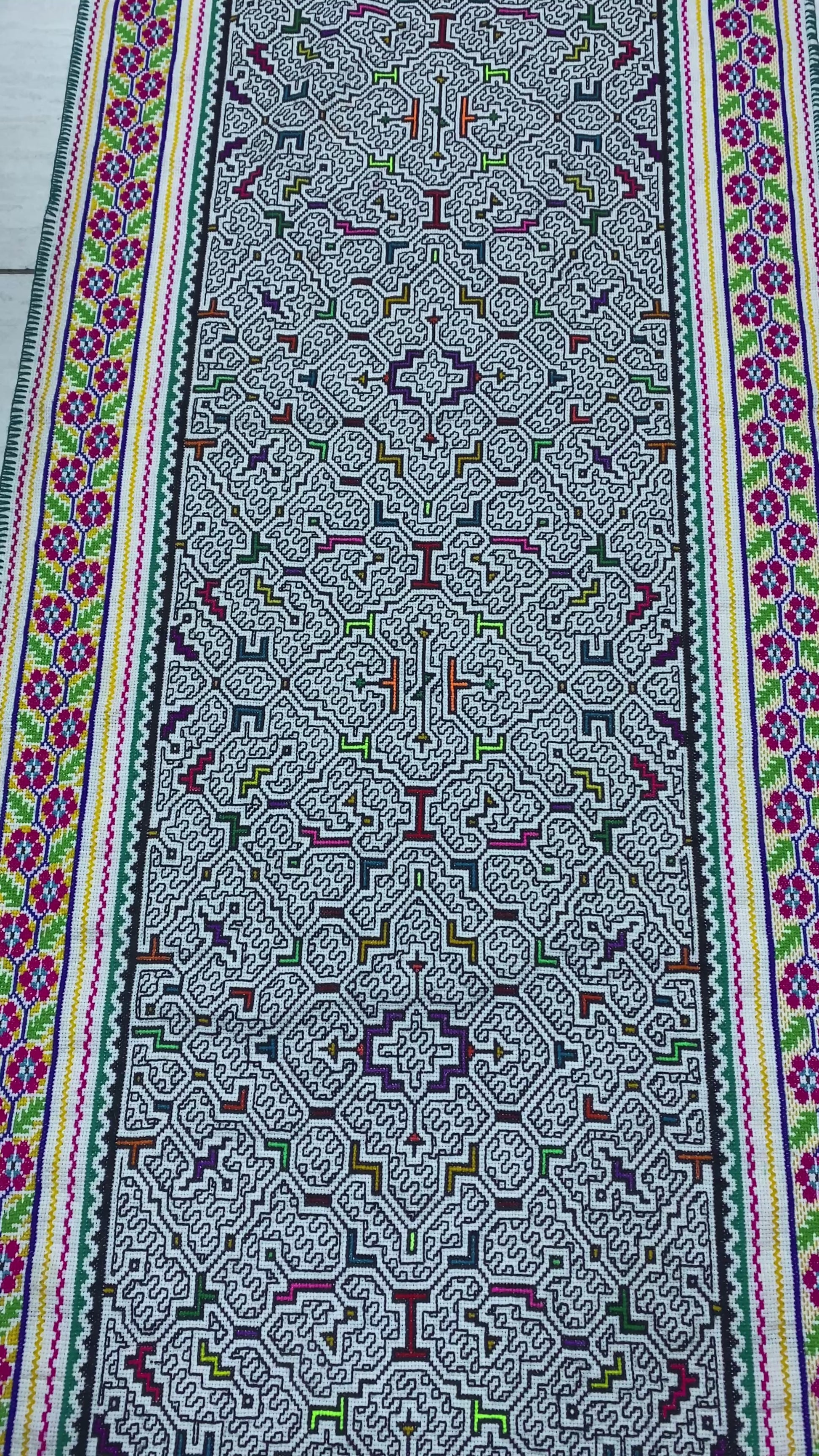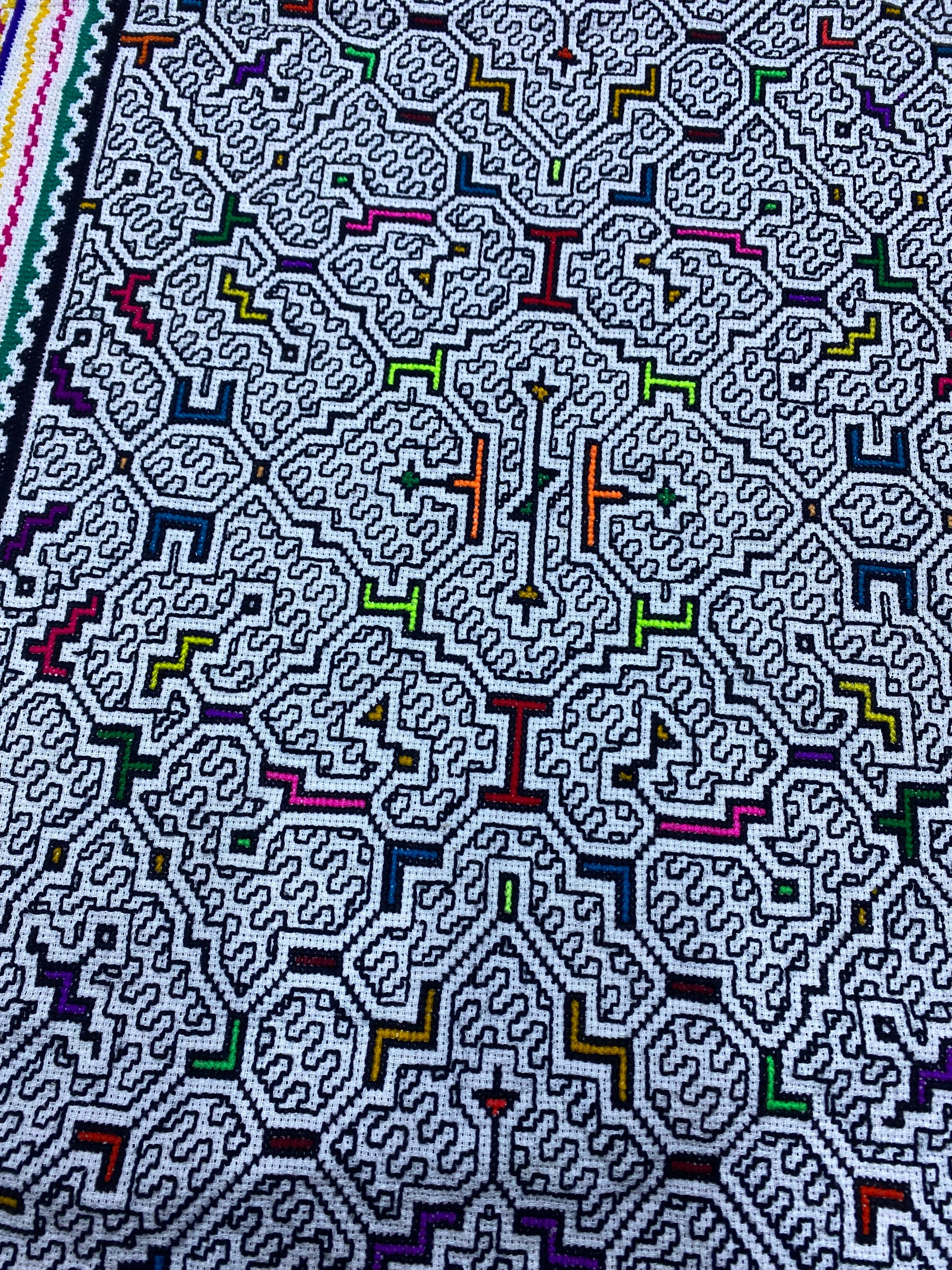 This hand embroidered tapestry was made by the Shipibo Conibo tribe who live in the Peruvian Amazon Rainforest in the provinces of Pucallpa. This tapestry is made by hand with no machines involved in the process. It can be used as a tablecloth or a wall tapestry.
