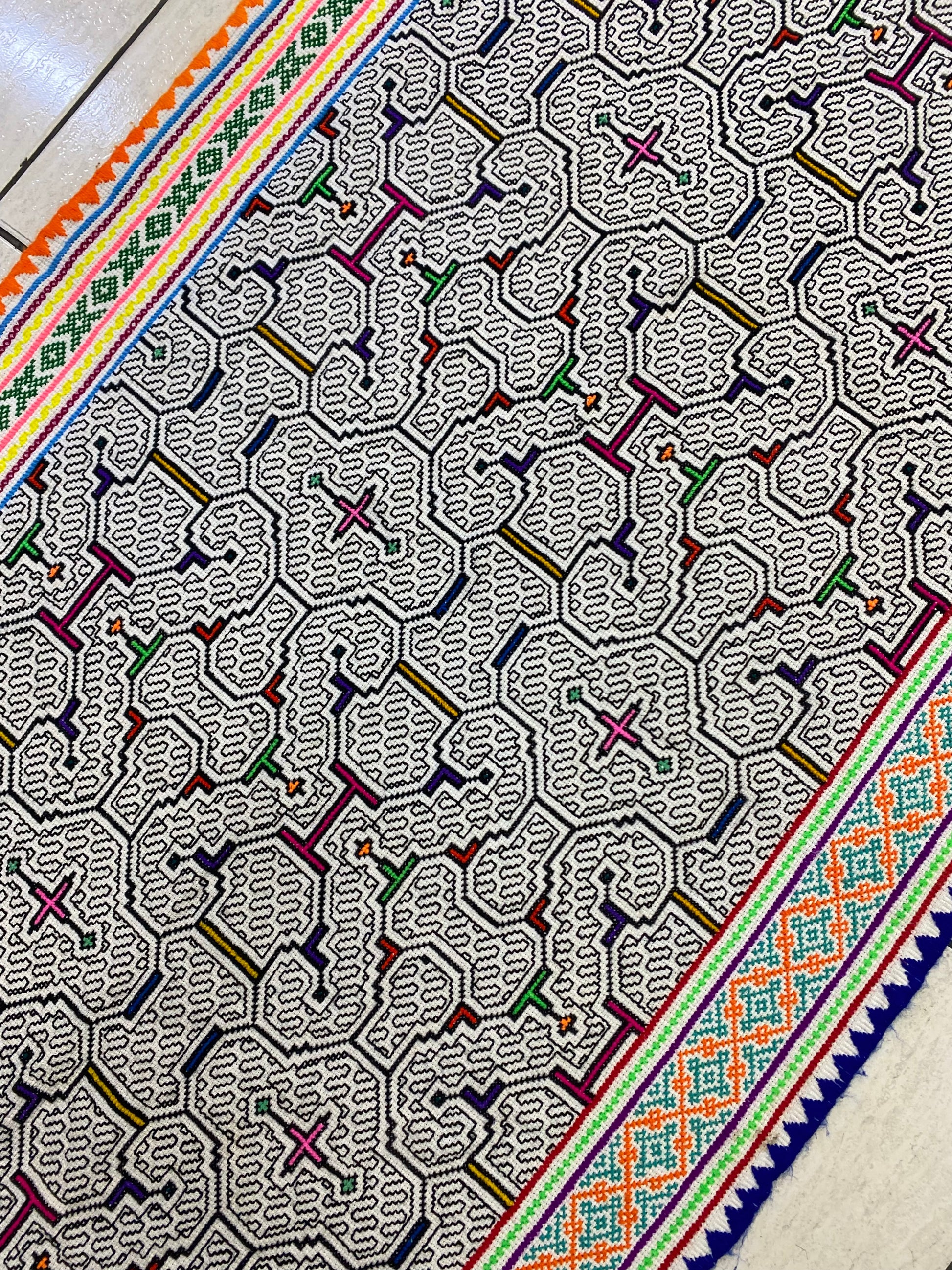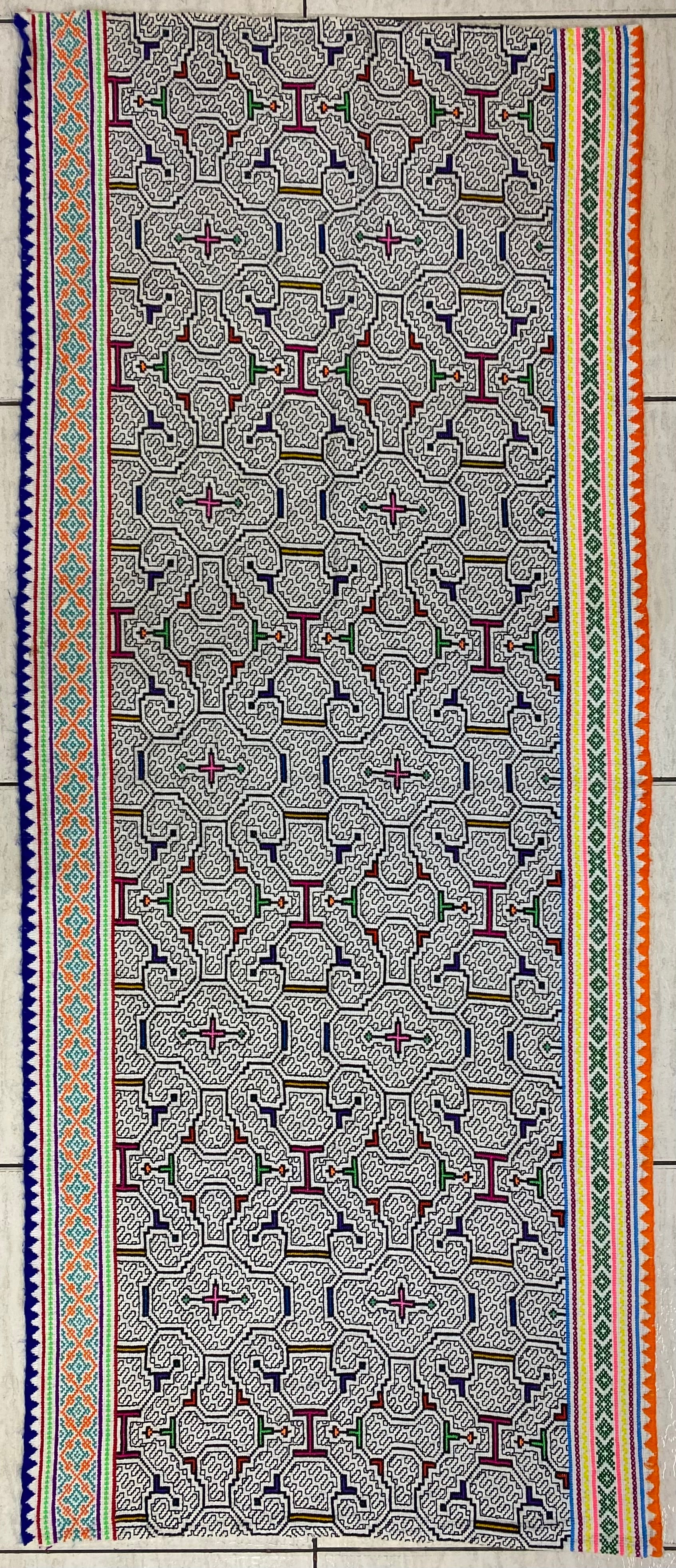 Shipibo Conibo Kené Tabletop Tapestry Hand Embroidered Peruvian Tablecloth Textile Ceremonial Amazonian Shamanic Altar 65”x 27”