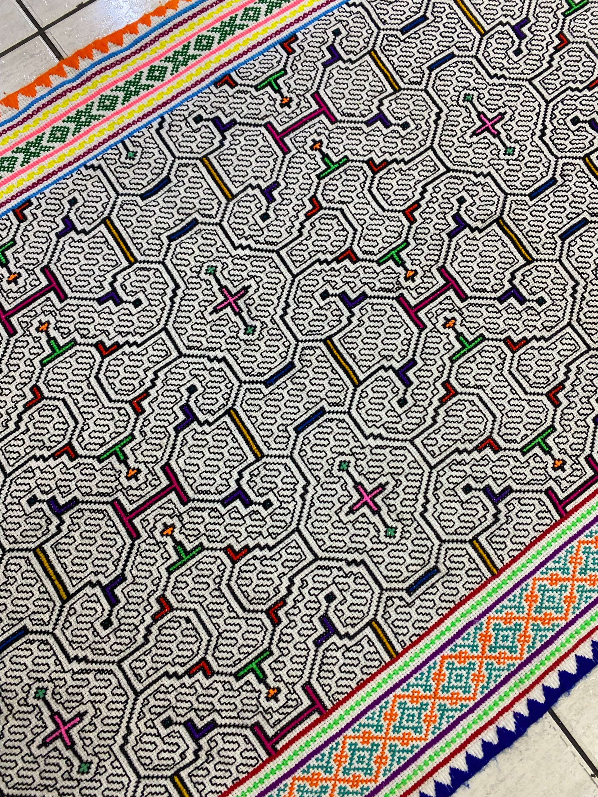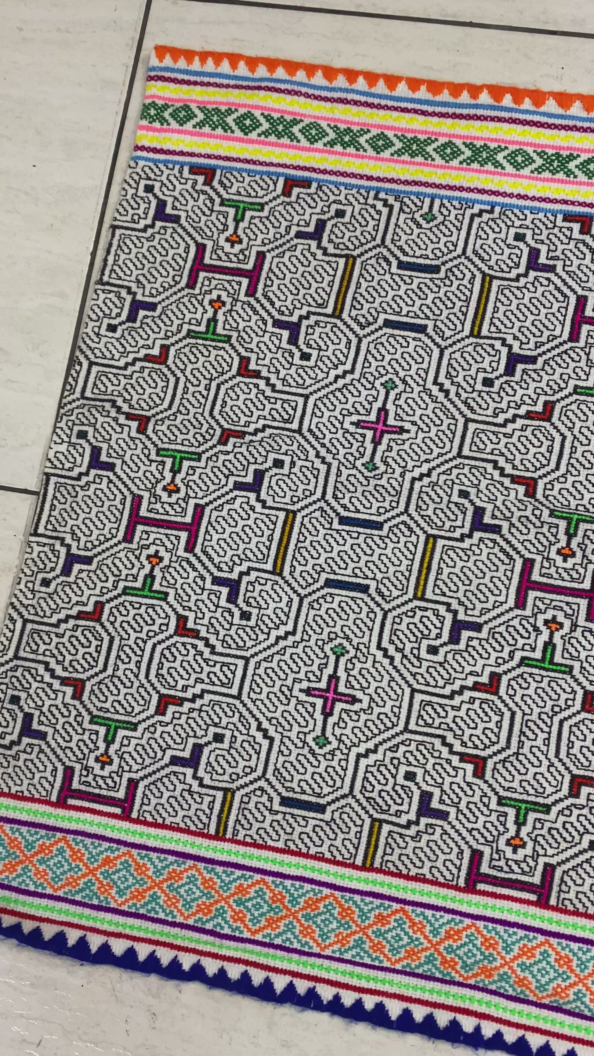 This hand embroidered tapestry was made by the Shipibo Conibo tribe who live in the Peruvian Amazon Rainforest in the provinces of Pucallpa. This tapestry is made by hand with no machines involved in the process. It can be used as a tablecloth or a wall tapestry.