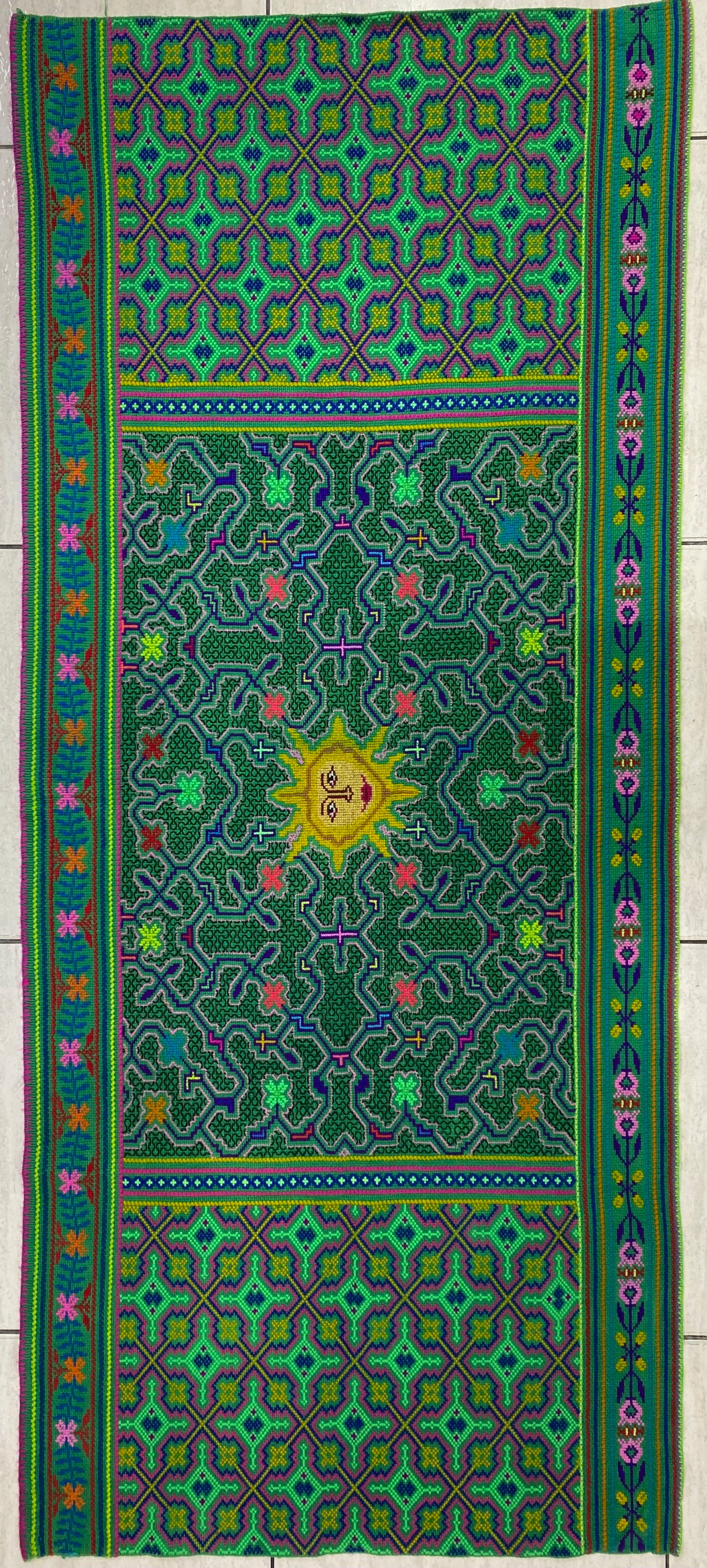 Shipibo Conibo Kené Tabletop Tapestry Hand Embroidered Peruvian Tablecloth Textile Ceremonial Amazonian Shamanic Altar 63”x 27”