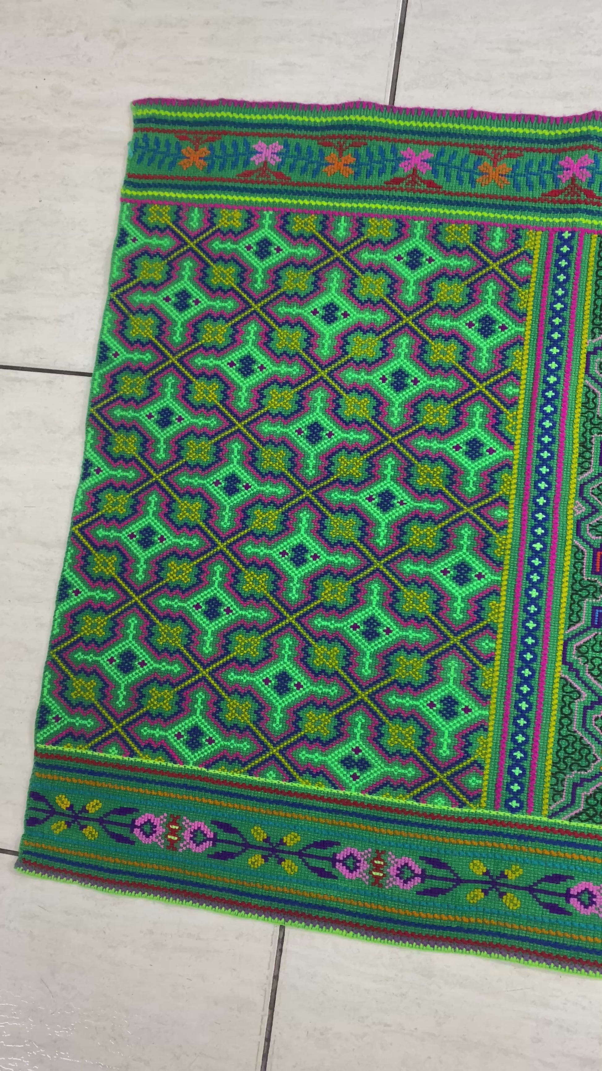 This hand embroidered tapestry was made by the Shipibo Conibo tribe who live in the Peruvian Amazon Rainforest in the provinces of Pucallpa. This tapestry is made by hand with no machines involved in the process. It can be used as a tablecloth or a wall tapestry.