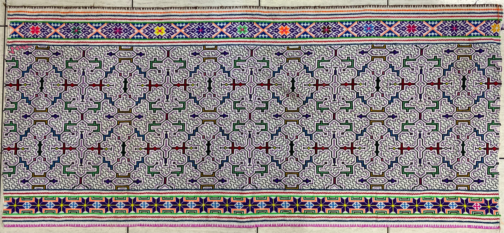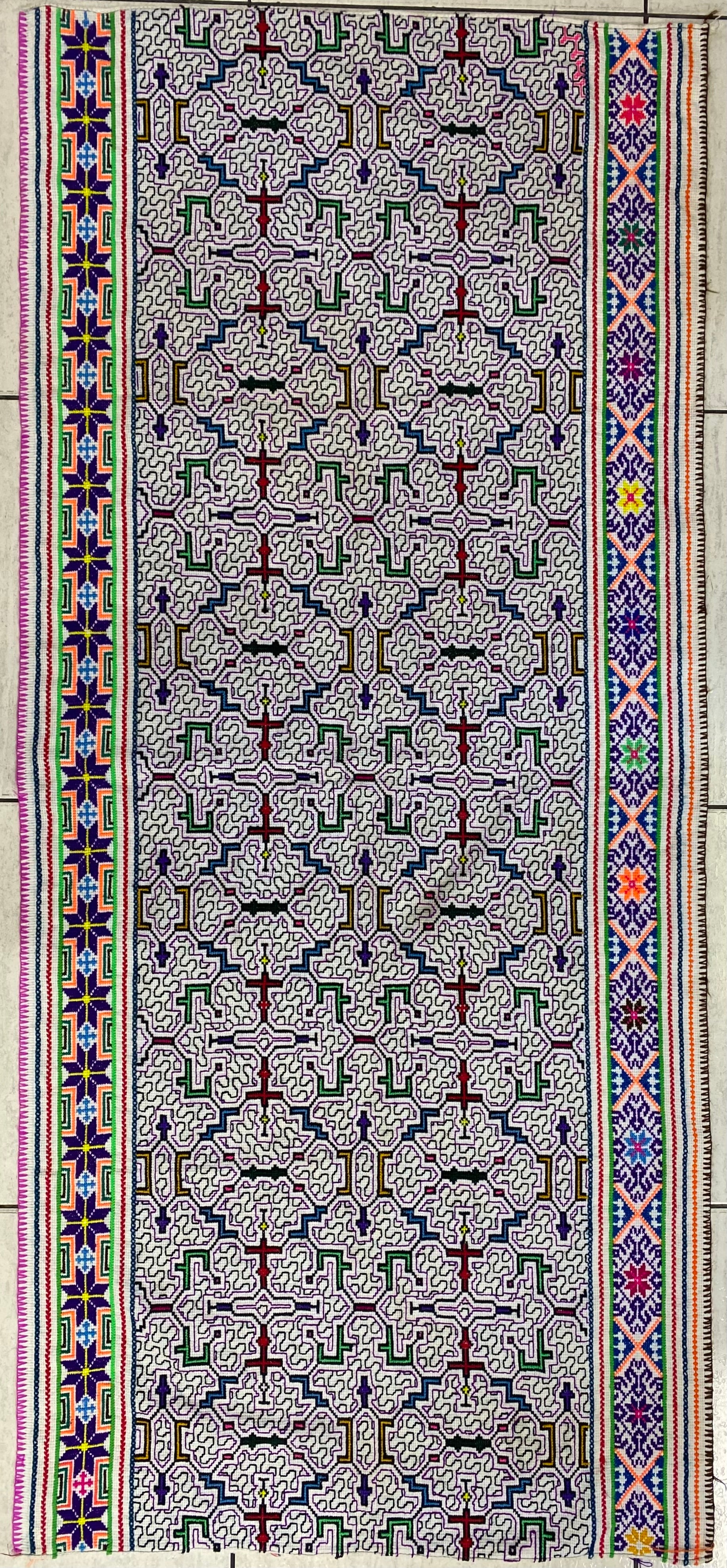Shipibo Conibo Kené Tabletop Tapestry Hand Embroidered Peruvian Tablecloth Textile Ceremonial Amazonian Shamanic Altar 62”x 27.5”