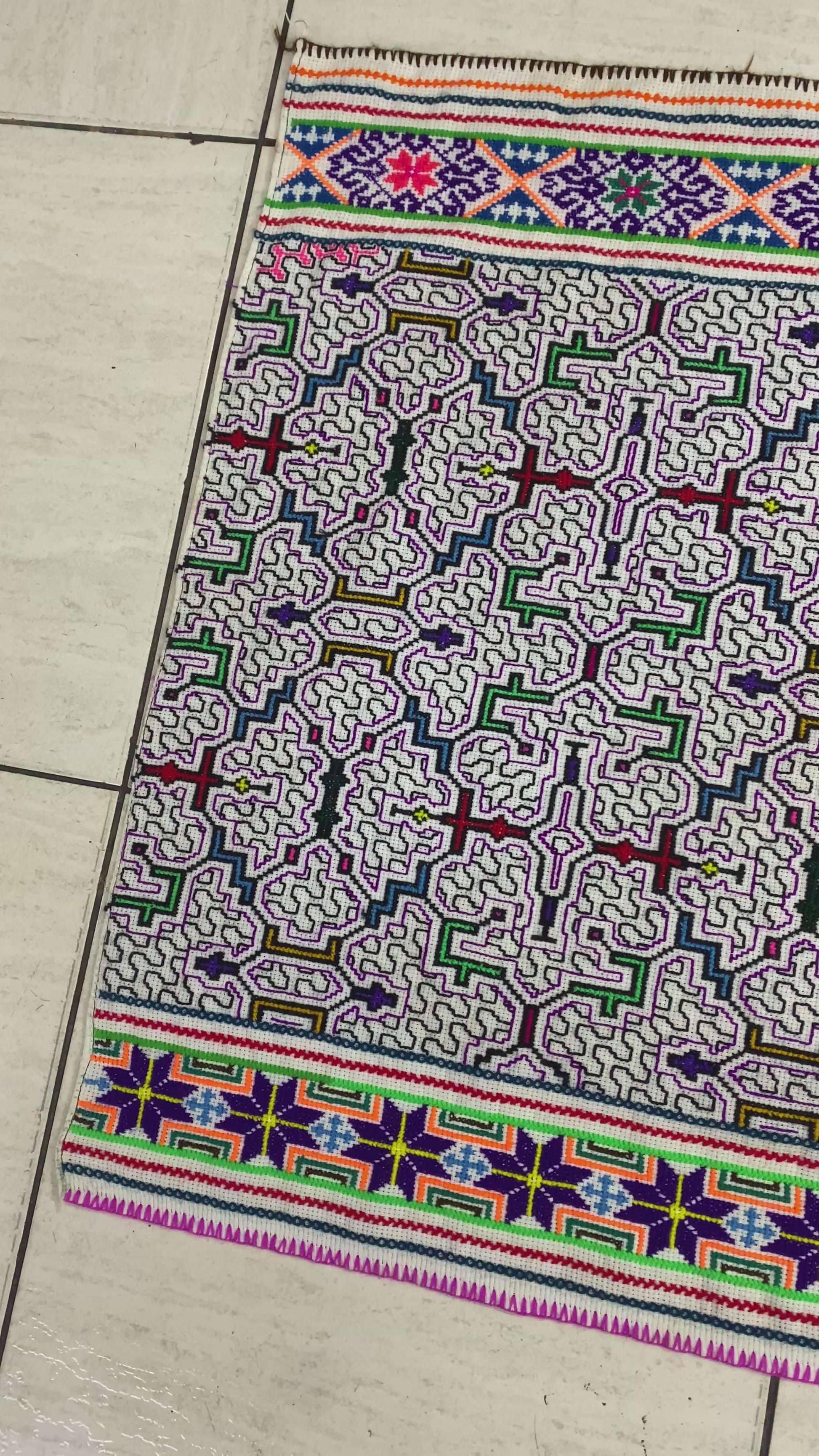 This hand embroidered tapestry was made by the Shipibo Conibo tribe who live in the Peruvian Amazon Rainforest in the provinces of Pucallpa. This tapestry is made by hand with no machines involved in the process. It can be used as a tablecloth or a wall tapestry.