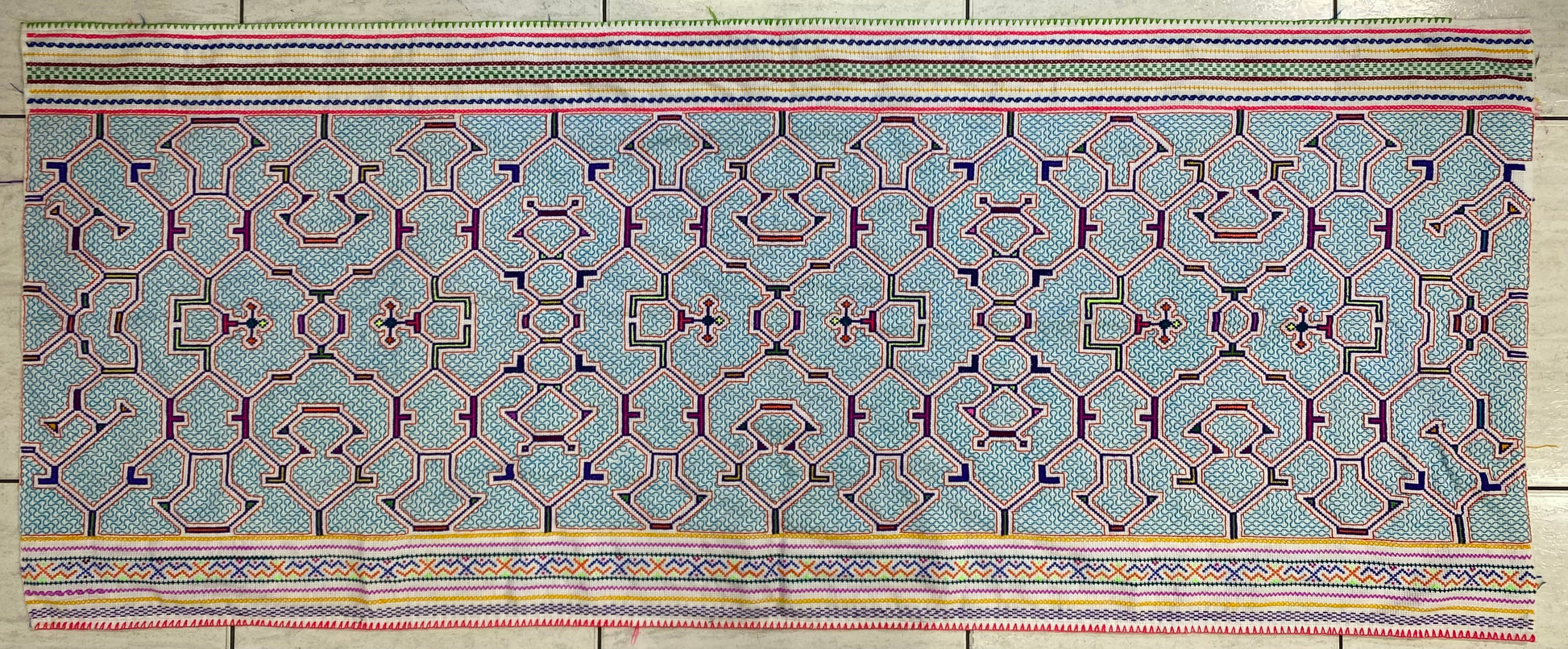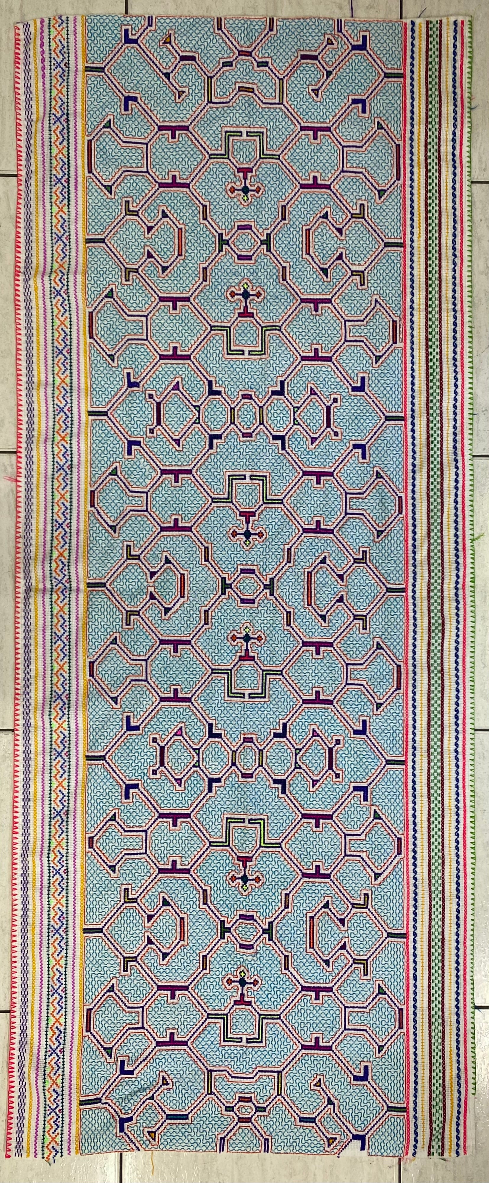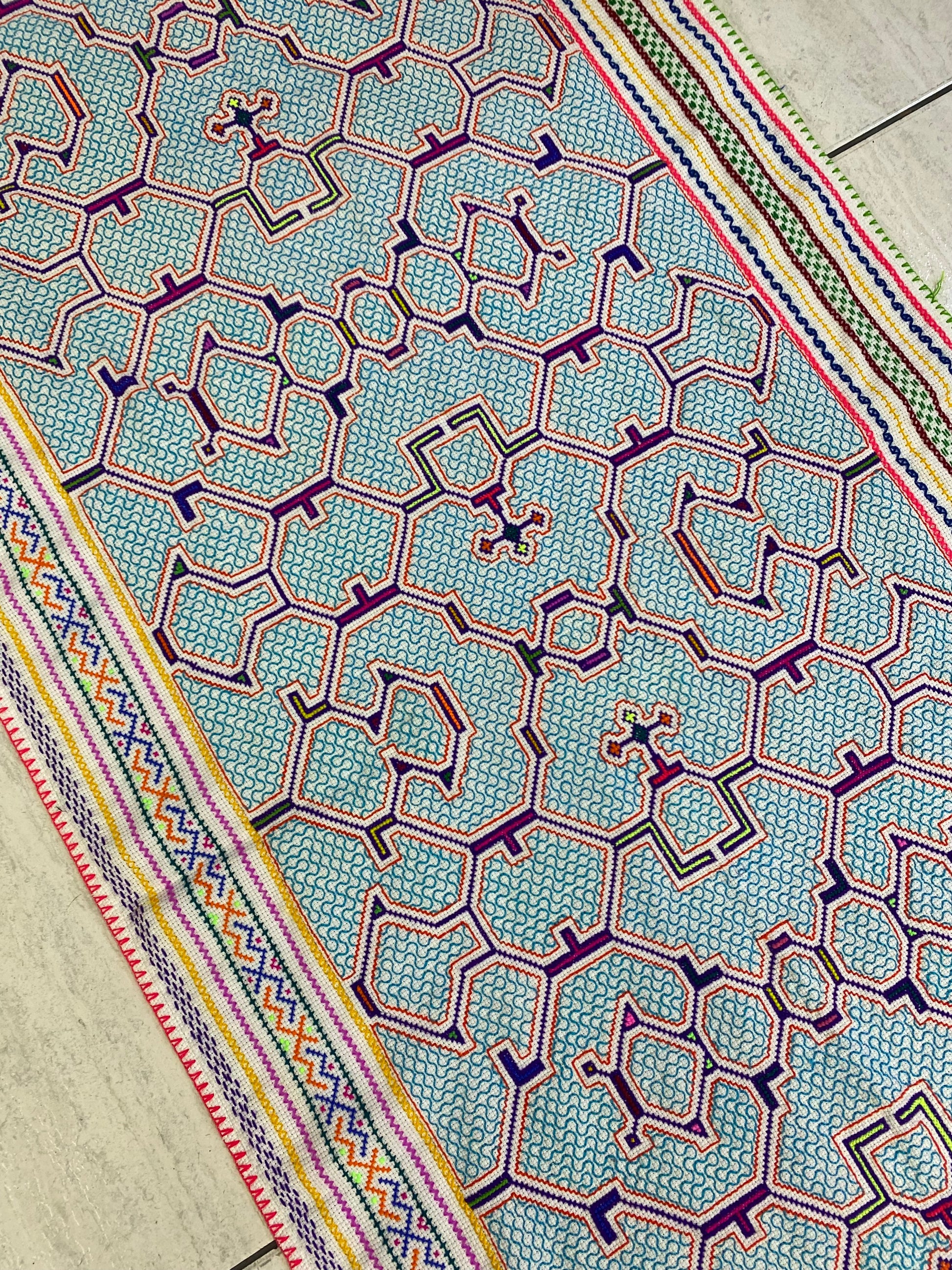 Shipibo Conibo Kené Tabletop Tapestry Hand Embroidered Peruvian Tablecloth Textile Ceremonial Amazonian Shamanic Altar 66”x 27”