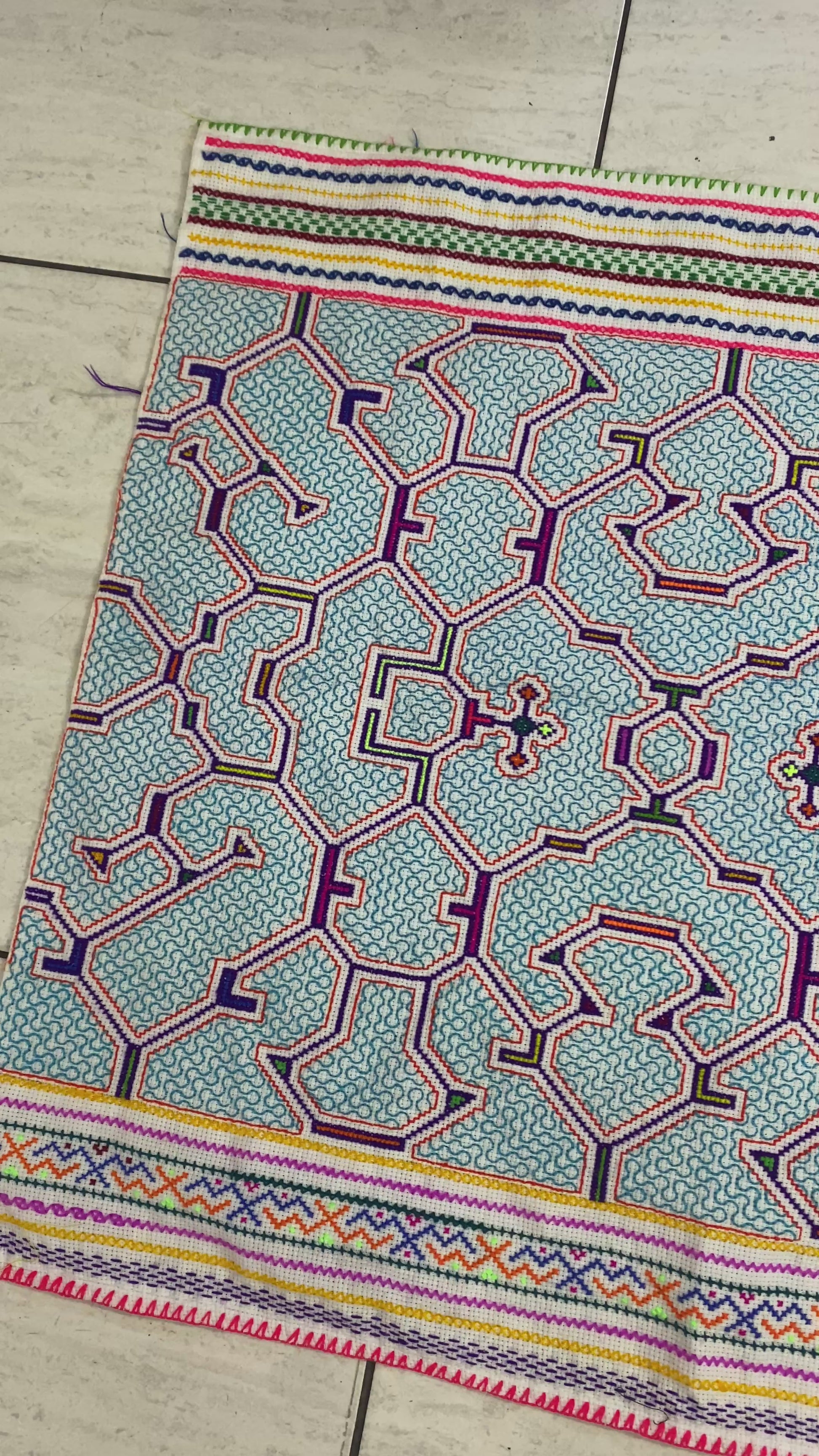 This hand embroidered tapestry was made by the Shipibo Conibo tribe who live in the Peruvian Amazon Rainforest in the provinces of Pucallpa. This tapestry is made by hand with no machines involved in the process. It can be used as a tablecloth or a wall tapestry.