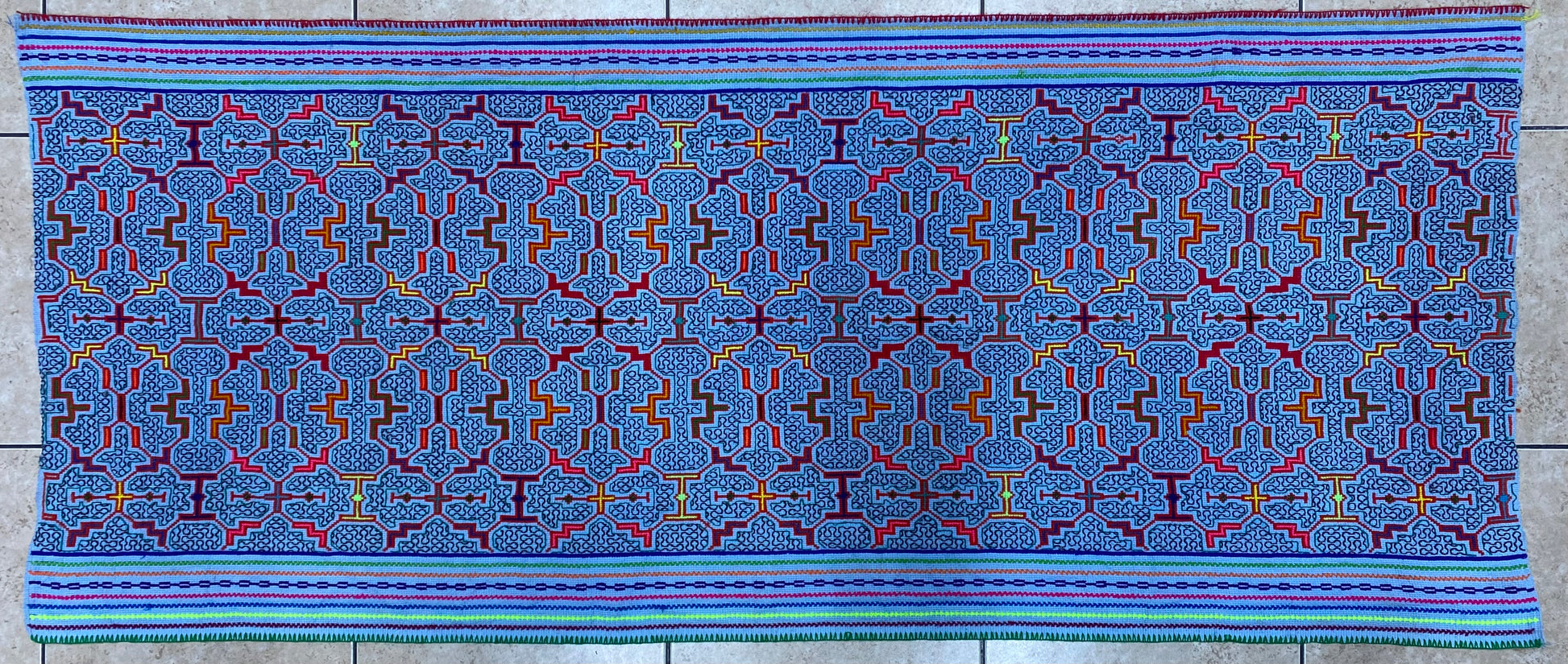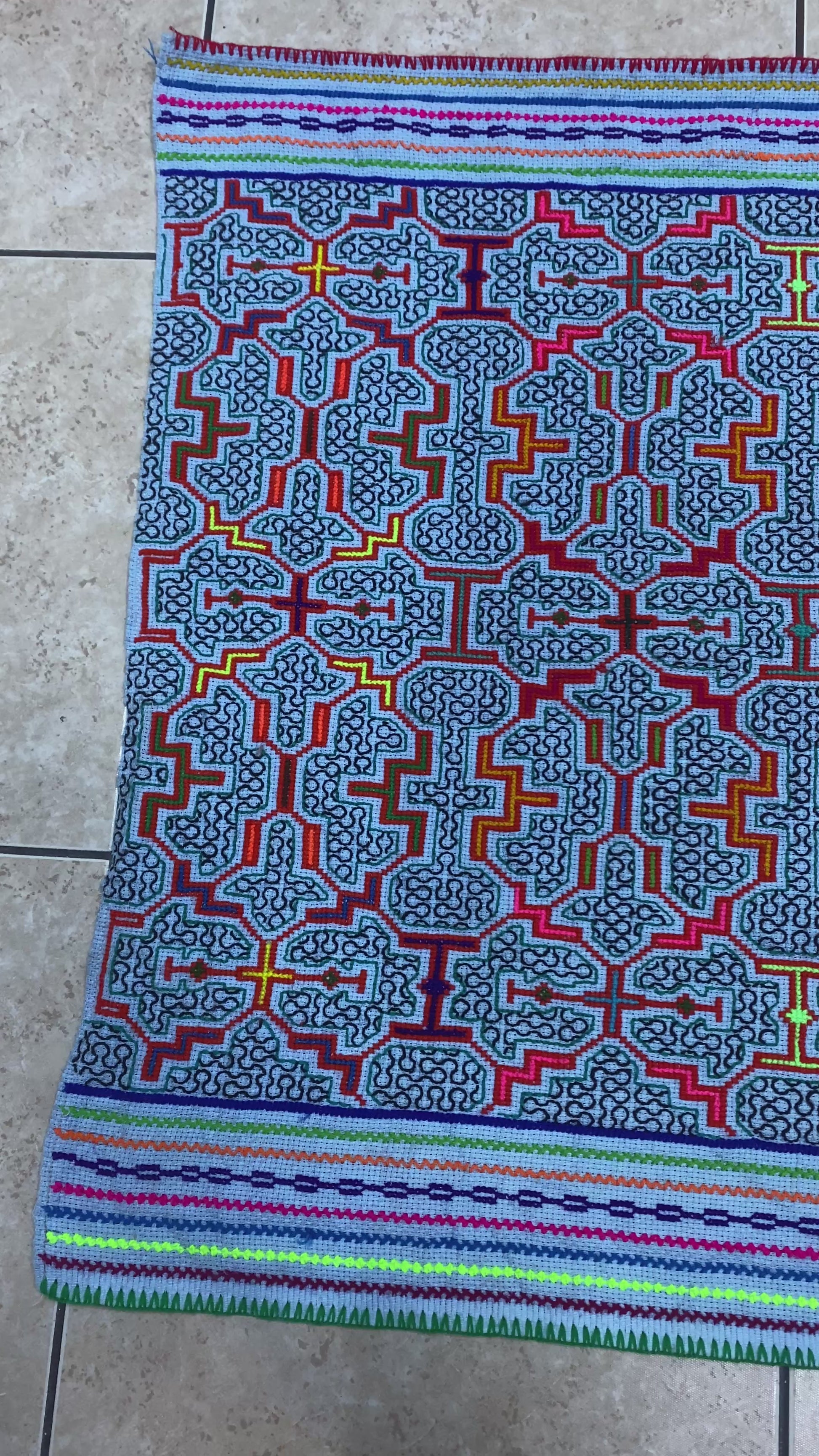Shipibo Conibo Kené Tabletop Tapestry Hand Embroidered Peruvian Tablecloth Textile Ceremonial Amazonian Shamanic Altar 60”x 26”