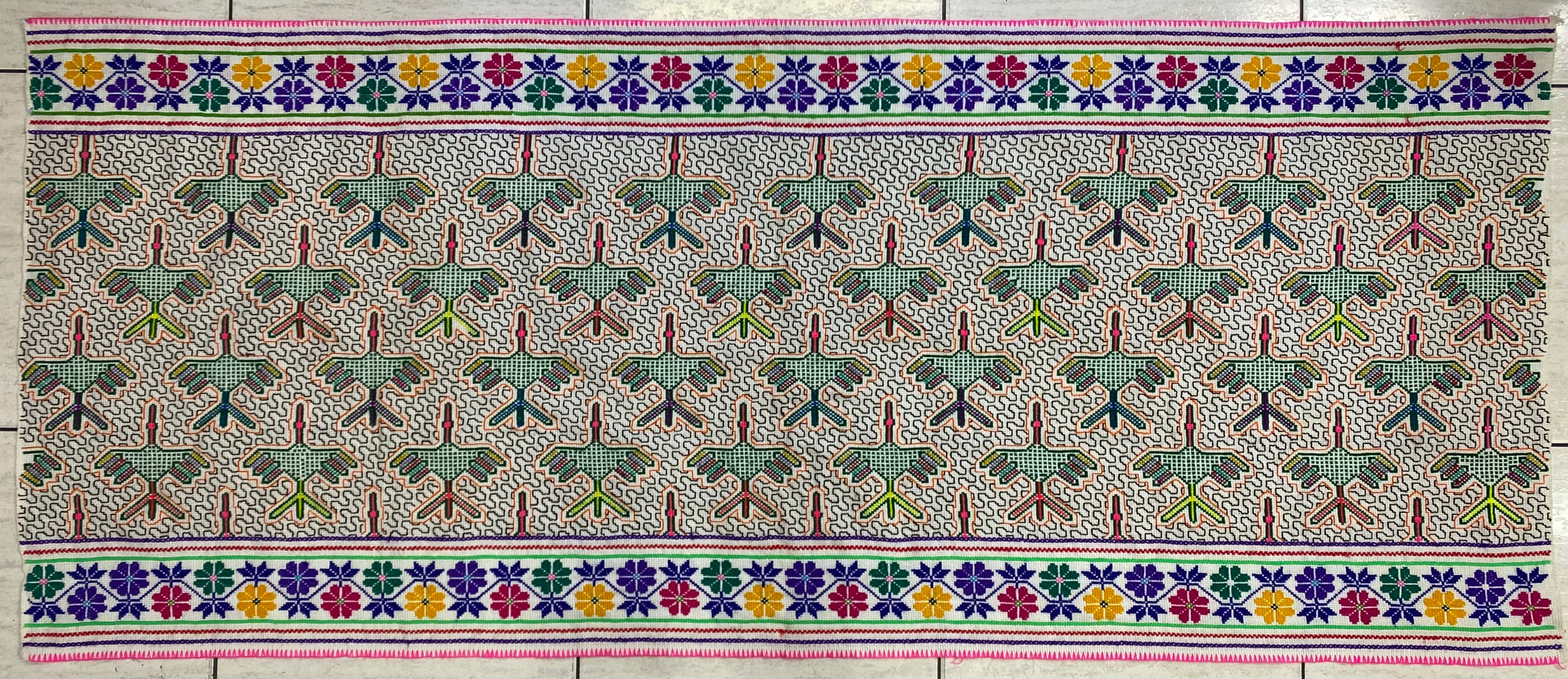 Shipibo Conibo Kené Tabletop Tapestry Hand Embroidered Peruvian Tablecloth Textile Ceremonial Amazonian Shamanic Altar 68”x 28.5”