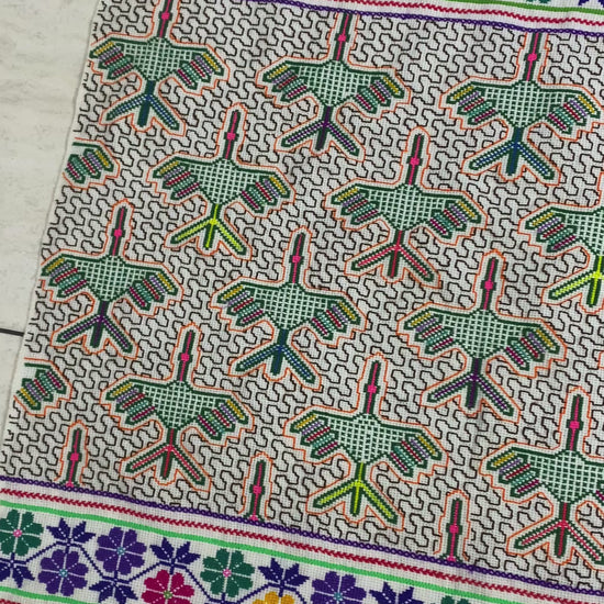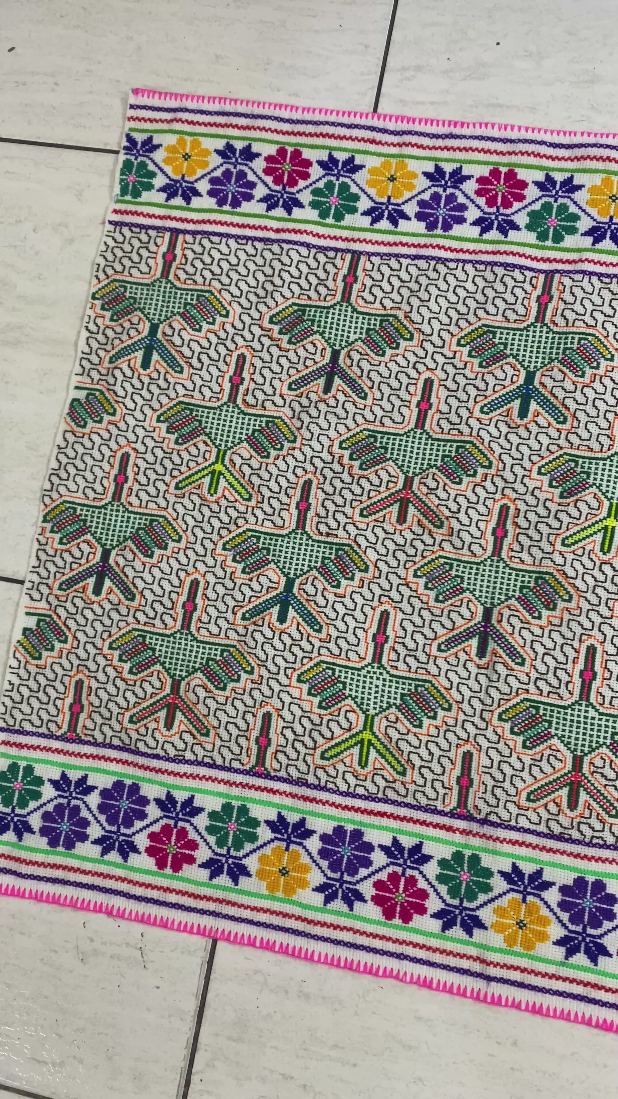 This hand embroidered tapestry was made by the Shipibo Conibo tribe who live in the Peruvian Amazon Rainforest in the provinces of Pucallpa. This tapestry is made by hand with no machines involved in the process. It can be used as a tablecloth or a wall tapestry.